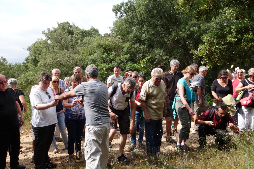 Chemin faisant, il nous invite à examiner un petit espace où coexistent en ce moment de la lavande sauvage ou aspic (nom local) dont l’arôme intéresse la parfumerie -à distinguer du lavandin mis en culture-, un genévrier, un chêne kermès, de l’immortelle jaune puis nous montre comment distinguer d’une part le chêne vert (blanchâtre sous la feuille) du chêne kermès -tous deux à feuillage persistant-, et d’autre part le genévrier (une bande blanche sous la feuille) du cade (deux bandes blanches).