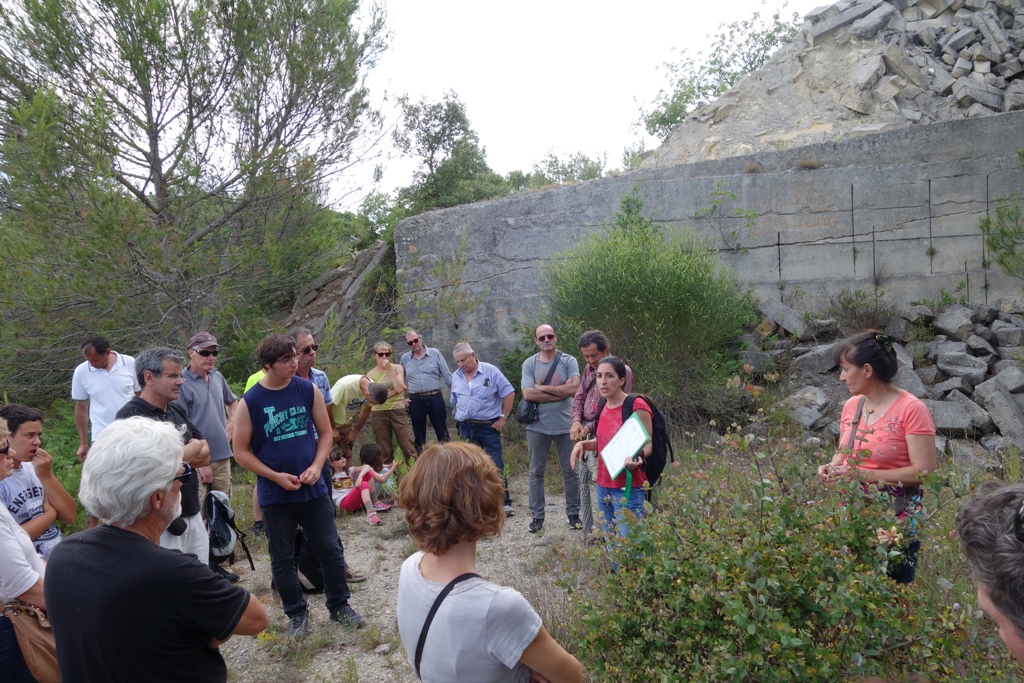 Pierre Michel nous parle des outils d’extraction qui ont évolué au fil des siècles. Il évoque l’escoude, pioche qui à l’époque romaine avaient deux pointes alors qu’au Moyen-Age le pic était plat. Le site est difficile à appréhender. Lisa Calixte nous apprend que la réglementation de l’exploitation des carrières a été tardive. Les concessions communales datent de la Révolution française. Le code minier remonte à 1810 et il a fallu attendre 1880 pour l’enregistrement des premières déclarations d’exploitation. Il s’agissait alors d’entreprises familiales. Depuis 1970, une déclaration en préfecture est obligatoire. Depuis 1994, l’exploitant d’une carrière doit la remettre en état. Les fronts de taille ne peuvent dépasser 10 mètres. Il s’agit d’un calcaire coquillier poreux mais compact qui permet la purification de l’eau par une lente infiltration dans les ancienne carrières qui jouent alors le rôle de bassin de décantation. On dispose de beaucoup d’eau en sous-sol. Les rebuts (pierres extraites présentant des défauts) que l’on aperçoit en quantité étaient utilisés par les ouvriers pour construire leur maison, des clôtures ou des petits bâtiments ruraux.