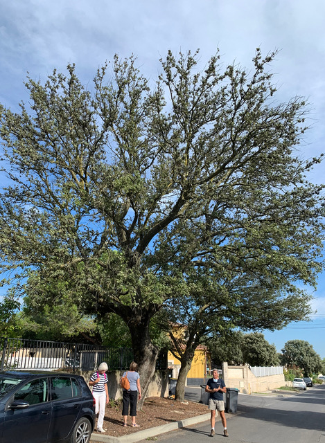Nous cheminons sur la route de Restinclières et pouvons observer une chênaie verte de hauteur moyenne sur la partie droite de la route avec un chêne blanc plus clair qui se détache de l’ensemble. On aperçoit à distance sur le trottoir de gauche une silhouette massive, plus claire. On peut voir à travers. En approchant on constate qu’il s’agit de deux arbres avec des densités de feuillage différentes, le gros cache le petit. L’un d’eux comprend plein d’axes morts. On peut parler de « dépérissement » pour des questions climatiques ou d’âge. Une météo très sèche va activer la mortalité. Il est mal parti. C’est sans doute un rescapé de la garrigue dans laquelle on utilisait autrefois certains arbres pour assurer de l’ombre aux moutons. Les constructions d’habitations ont entamé la garrigue mais certains arbres ont été épargnés quand ils se trouvaient en limite de parcelles. Le chêne vert que nous avons sous les yeux a subi des coupes de racines dans le cadre des aménagements de voirie à l’origine peut-être de ses difficultés actuelles. Les jours de ce bel arbre sont comptés…
