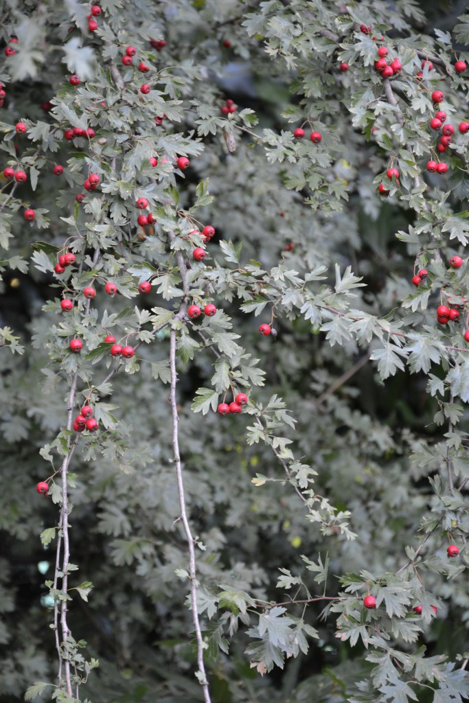 Nous circulons sur une voie piétonne aux abords du nouveau lotissement. Petit clin d’oeil à une aubépine à ne pas confondre avec l’azérolier, preuve à l’appui après examen de la baie rouge par Yves qui compte le nombre de style restant sur le fruit (un seul : aubépine, plusieurs : azérollier).