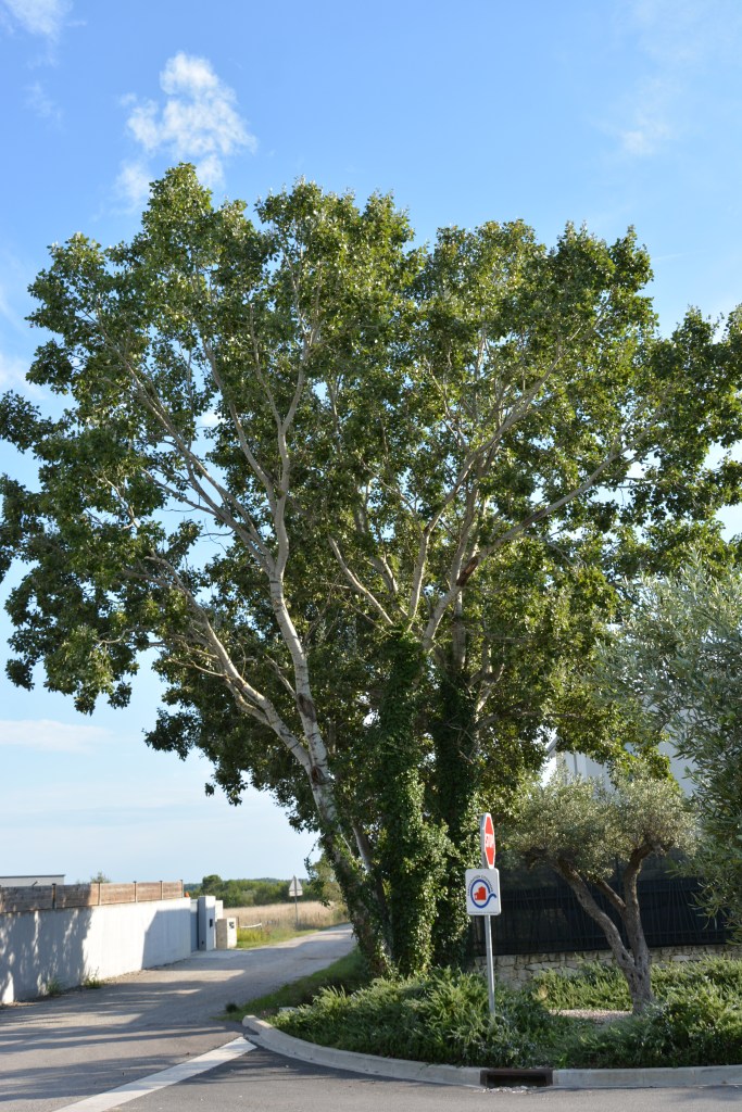 Après les jeux pour enfants très fréquentés ce samedi après-midi, nous arrivons à un carrefour qu’orne un très beau peuplier blanc généreux qui ne ressemble pas au peuplier noir habituel en faisceau ou cylindrique (port fastigié). Yves indique que le peuplier est un arbre qui forme une large couronne. On peut voir de beaux peupliers noirs au bord de la Mosson.