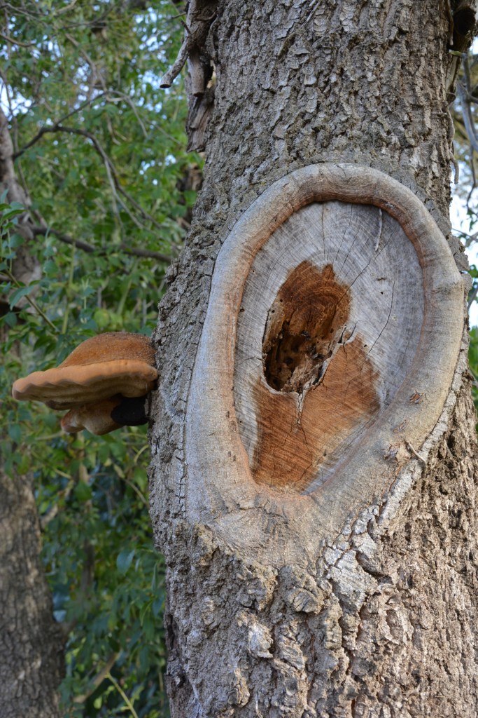 Sur le chemin du château menant chez Louise Achard, nous nous arrêtons devant un frêne à feuilles étroites dont le tronc héberge un champignon marron. Yves nous explique que ce champignon s’est d’abord développé à intérieur du tronc puis il a sorti ses fructifications. Entre l’arbre et le champignon s’opère un échange mutuel : l’arbre fournit les produits de la photosynthèse et le champignon l’eau et des éléments minéraux qui alimentent les racines de l’arbre. En cas de déséquilibre, l’arbre peut dépérir.