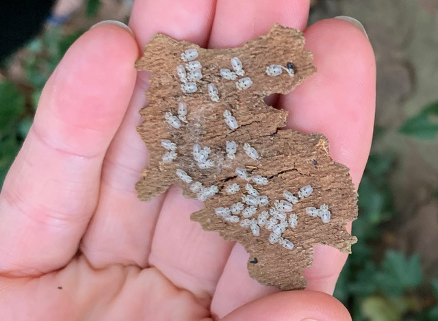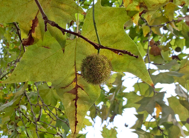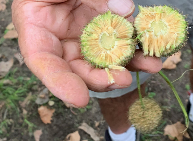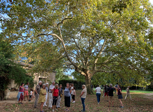 Le clou de la sortie est un magnifique platane dans la propriété de la vice-présidente d’A.R.B.R.E. Nous nous plaçons à l’aplomb de sa couronne qui mesure quelques 24 mètres de diamètre (haut-pied). Le tronc mesure 80 cm de diamètre environ. Yves nous signale un platane à Lamanon (Bouches-du-Rhône) dont la couronne mesure 50 mètres de diamètre. Normalement le platane « marcotte » en émettant des racines sur les branches qui touchent le sol. Quand on ramasse ses feuilles tombées au sol on le prive de nourriture, on interrompt le cycle naturel en empêchant des insectes et des bactéries de se développer. Yves décortique une boule de platane (ensemble de fruits) pour en extraire un fruit contenant une graine minuscule à l’intérieur. S’agissant d’un arbre hybride, cela ne donnera rien. Il nous montre les petits poils qui provoquent de l’allergie quand les fruits sont mûrs à l’automne et au printemps sur les jeunes pousses.
