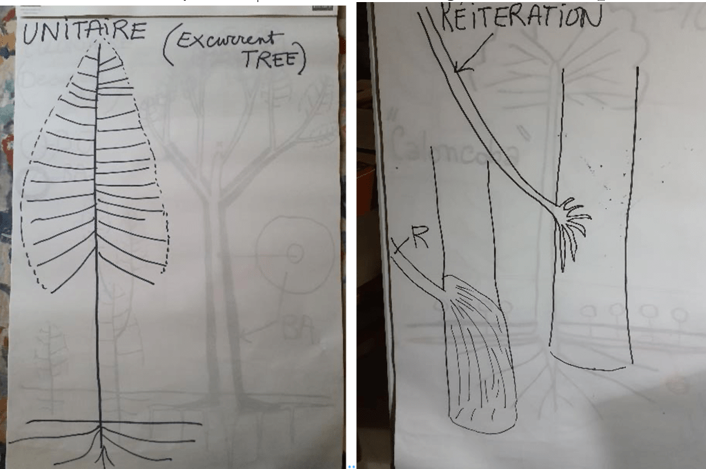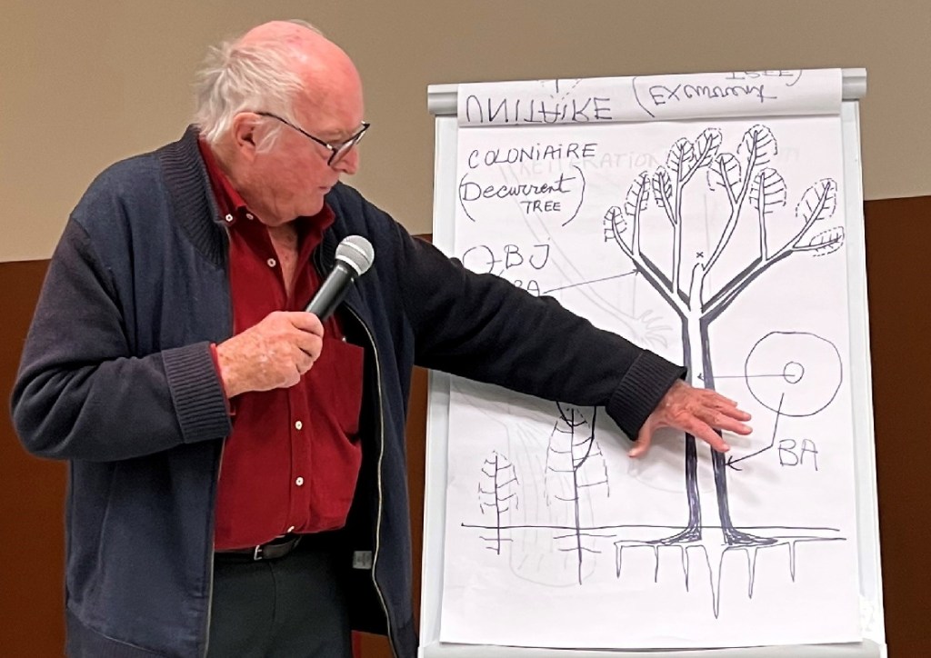 Francis Hallé prend la parole après avoir préparé quelques dessins sur un tableau à feuilles multiples. Il rappelle qu’il étudie depuis longtemps les arbres. Un arbre n’est pas un « individu ». On en parle parfois comme un « sujet ». On devrait dire tout simplement « un arbre ». Si les humains sont indivisibles, ce n’est pas le cas de l’arbre. On peut le couper en plusieurs morceaux, ses racines lui permettront de repartir. Ce n’est donc pas un individu.