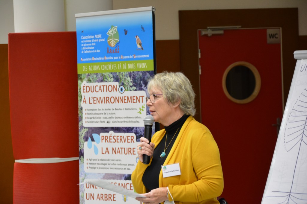 En introduction, Jacqueline Taillandier, présidente de l’association, rappelle brièvement l’historique, les objectifs et les activités poursuivis depuis dix ans par l’ARBRE : animations par des spécialistes dans les écoles des deux communes, sorties botaniques, géologiques, ornithologiques et batraciens, plantations d’espèces méditerranéennes dans les deux parcs botaniques à l’occasion des naissances, création d’un sentier botanique dans les carrières de Beaulieu, conférences-débats, déplacements doux.