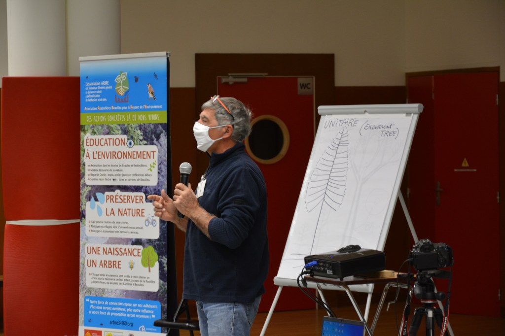 Yves Caraglio, botaniste et chercheur au CIRAD, référent scientifique de l’association, présente les deux intervenants de la soirée : Francis Hallé, professeur émérite de botanique à l’Université de Montpellier et Pierre Mirallès qui aura une approche littéraire, assistée d’Odile Sirlin, professeure agrégée de Sciences de la vie et de la terre (SVT) au lycée Georges Pompidou de Castelnau-le-Lez.