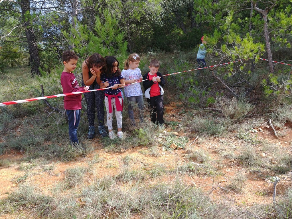 Dans un premier temps les enfants cherchent les indices placés par les deux animatrices puis en petits groupes ils partent à la recherche d’indices « réels ».