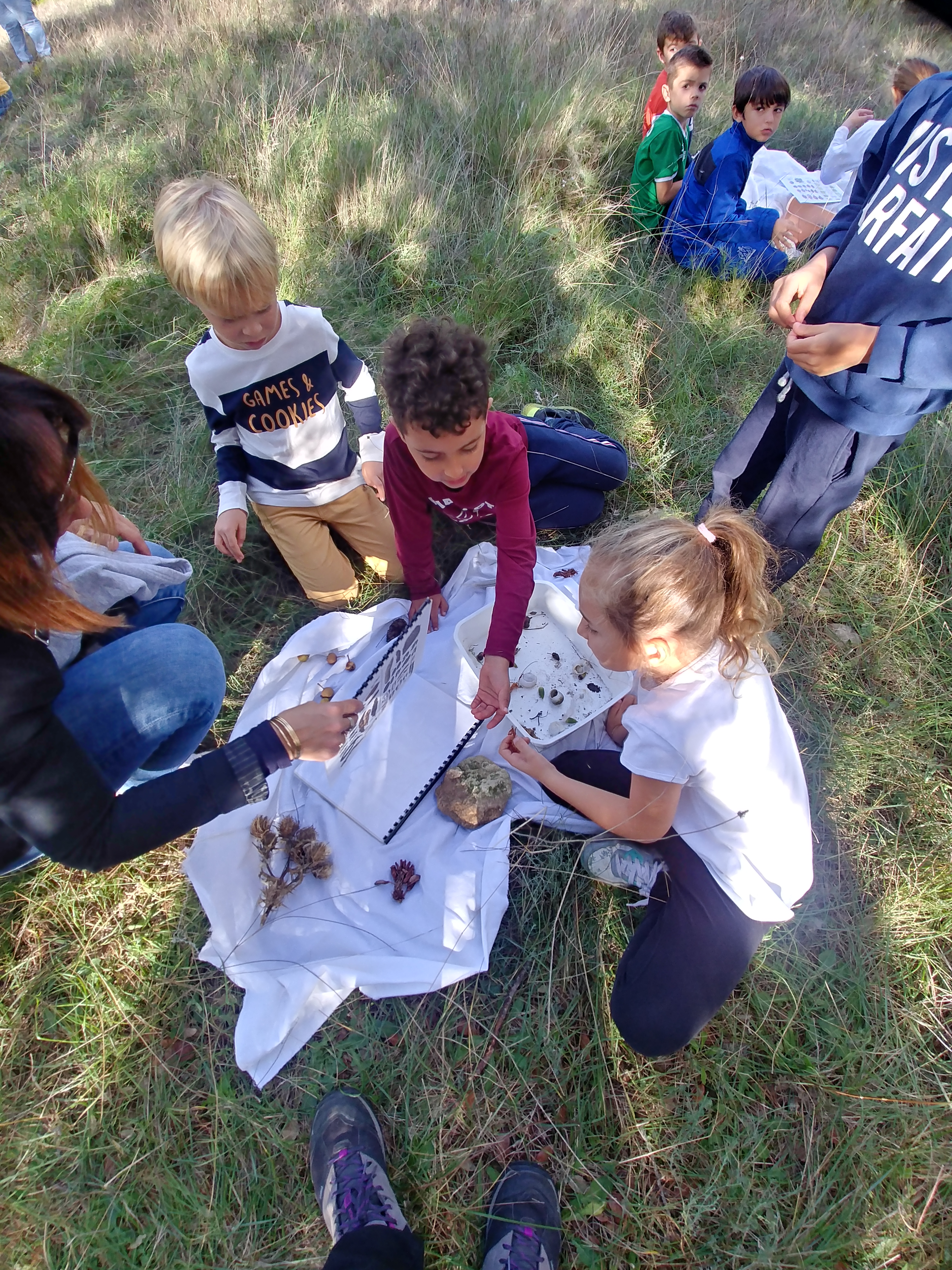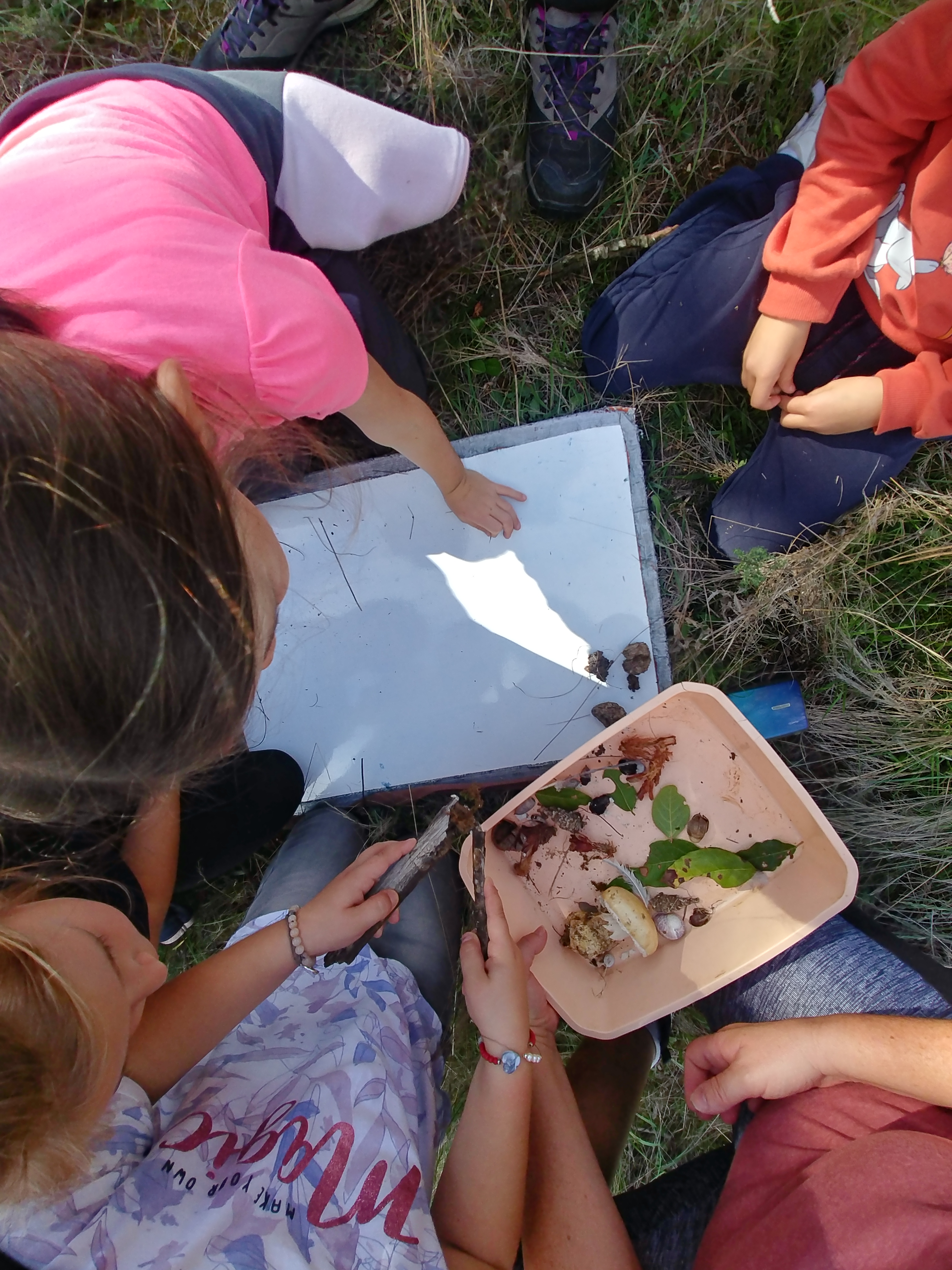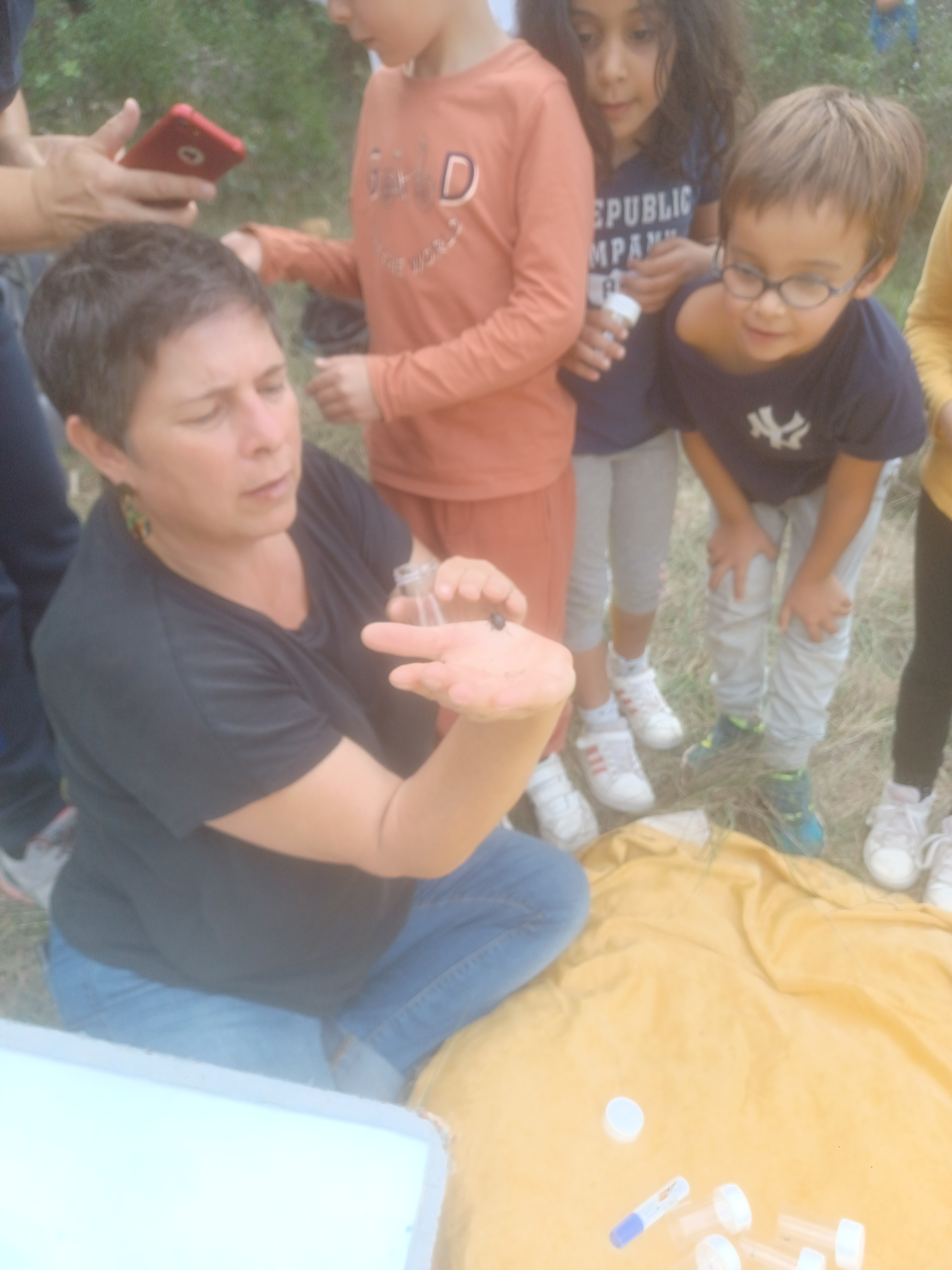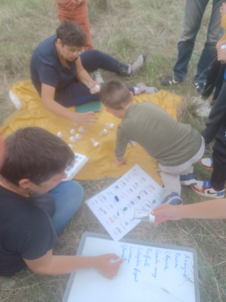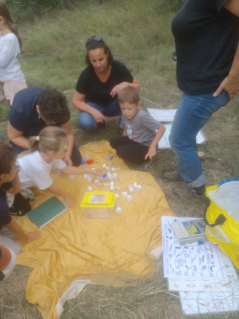 Installés en grand cercle, tous ont écouté les instructions des Ecologistes avant de se répartir en groupes de 4 ou 5, guidés par les parents, pour aller ramasser des insectes ou petites bêtes et les placer délicatement dans des boîtes transparentes, à rapporter ensuite sur un drap, à l’intérieur du cercle.
