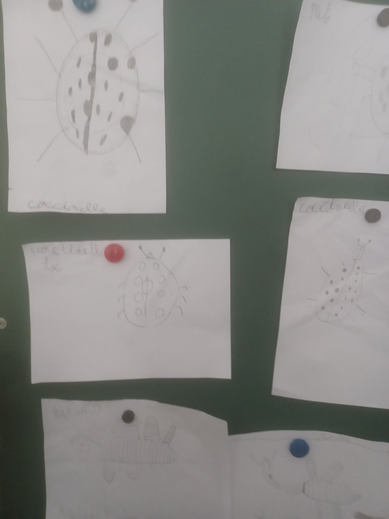 🐜 À 14h les 24 élèves de CP de Mme Vaxelaire étaient réunis en classe pour un petit rappel des informations apprises le matin sur les insectes et petites bêtes, avec Emilie et Khelia. Ensemble, ils avaient observé les planches offertes aux Ecologistes par un généreux donateur, et pu ainsi distinguer les insectes à 6 pattes des autres petites bêtes. Leurs dessins à partir de ces données étaient épinglés sur des tableaux au mur, et une superbe photo de sauterelle brillait sur un grand écran, devant le tableau.