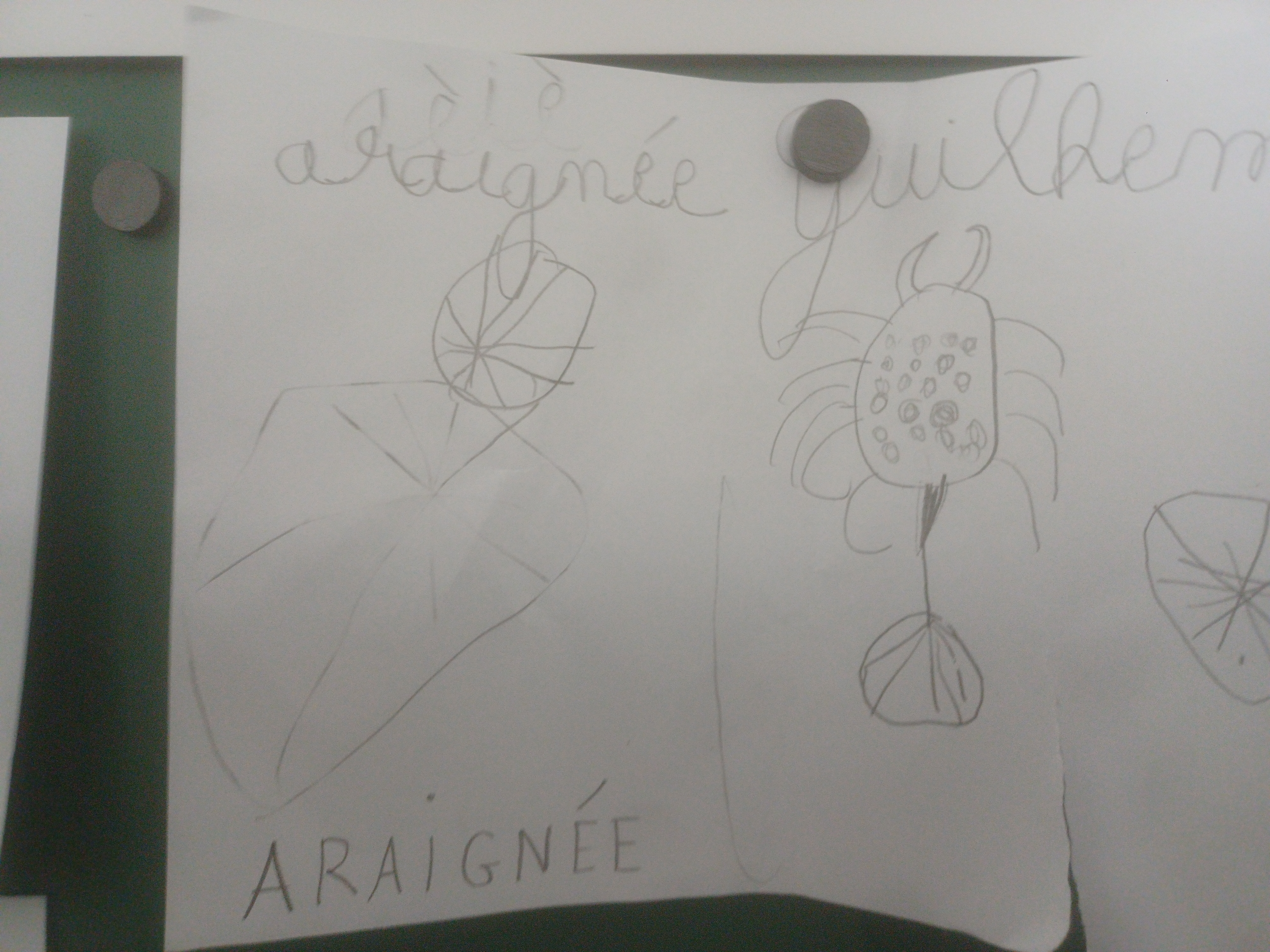 Une heure plus tard, les boîtes rapportées comptaient 14 insectes, 5 arachnides, 2 mollusques (limace, petit escargot), un crustacé et 1 myriapode (poisson d’argent). Après une minutieuse observation de leurs prises (passablement stressées dans leur petite boîte transparente !), les enfants ont dessiné chacun un des prisonniers avant leur libération dans la nature.