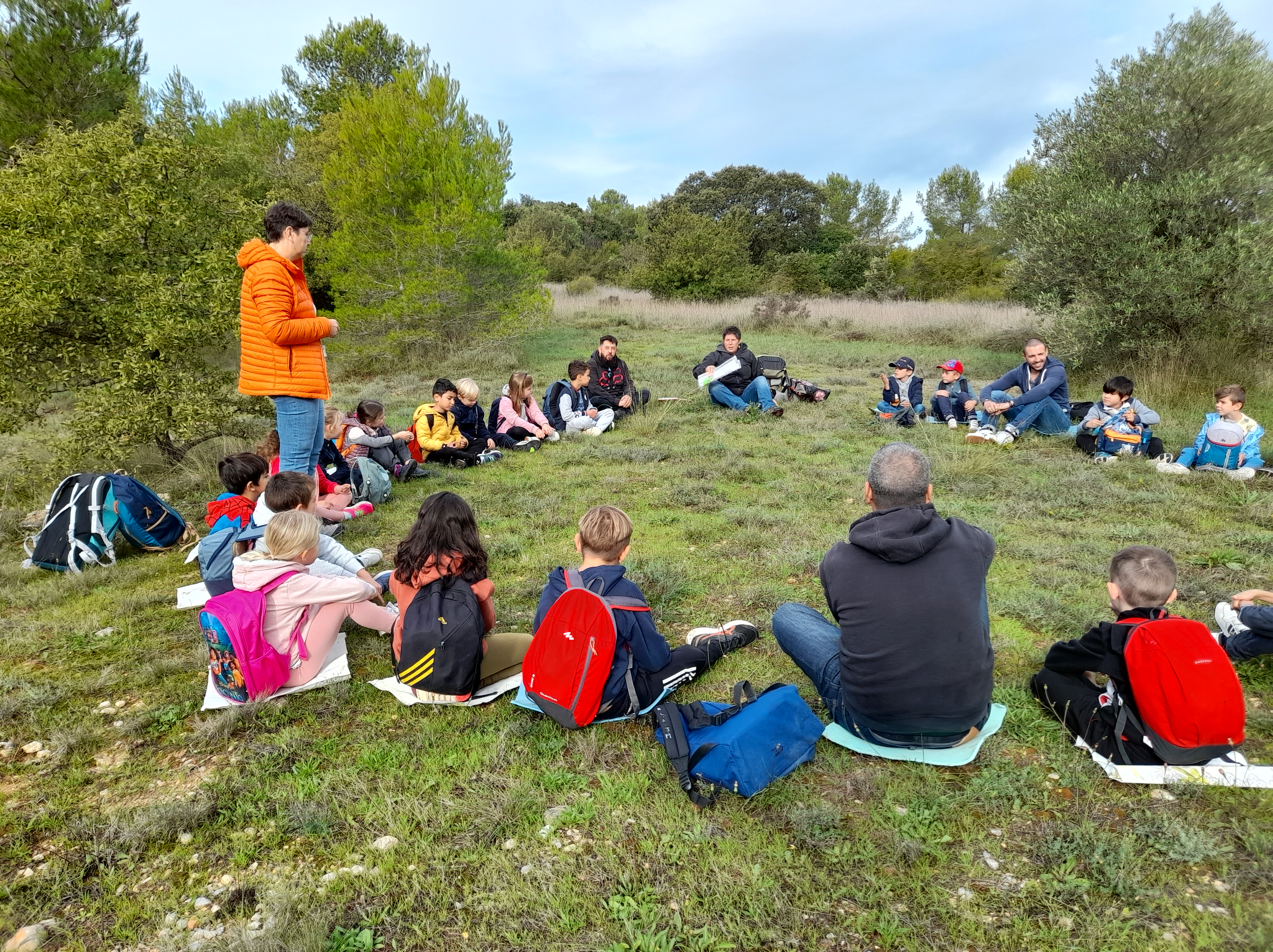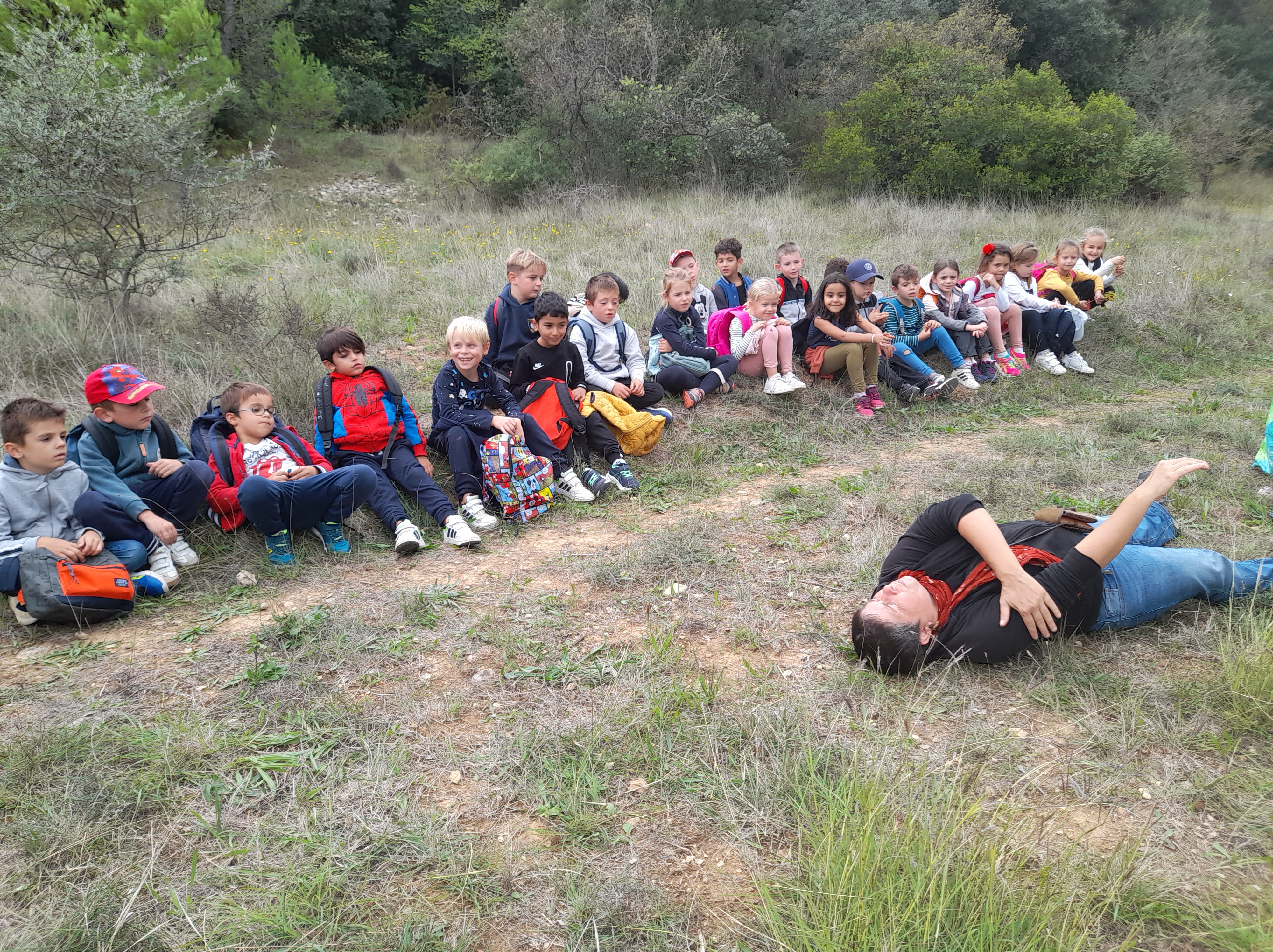 Petit chemin derrière l’école, la classe rejoint l’espace verdoyant prévu pour passer la journée, accompagnée de la maîtresse, Emilie, trois Papas et moi-même.