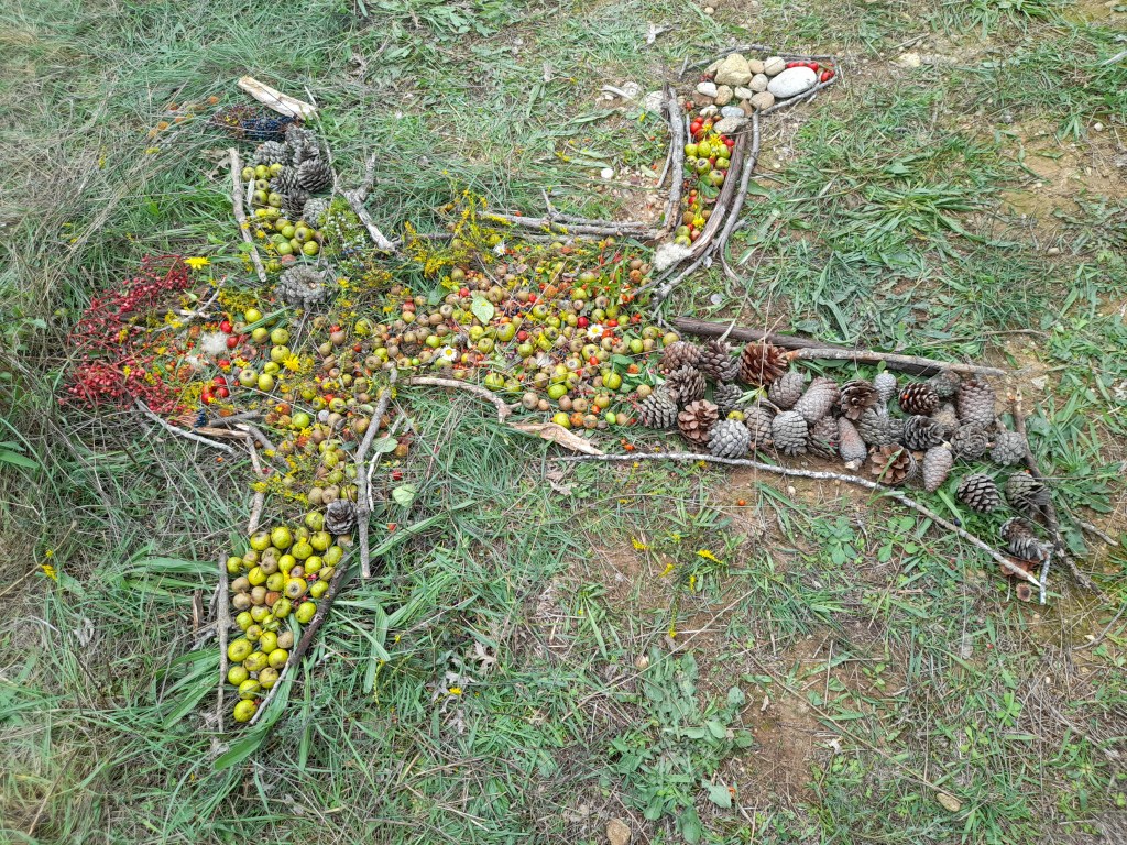 Et pour terminer… deux équipes créent un « Land Art » avec tous les matériaux récoltés (fruits colorés, fleurs, feuilles, petites branches, cailloux, coquilles d’escargot …). Un enfant s’allonge sur le sol dans une position de son choix, et ses camarades le dessinent à l’aide de petites branches ou de cailloux, puis la silhouette est « remplie » avec les éléments récoltés précédemment. (Voir photos).