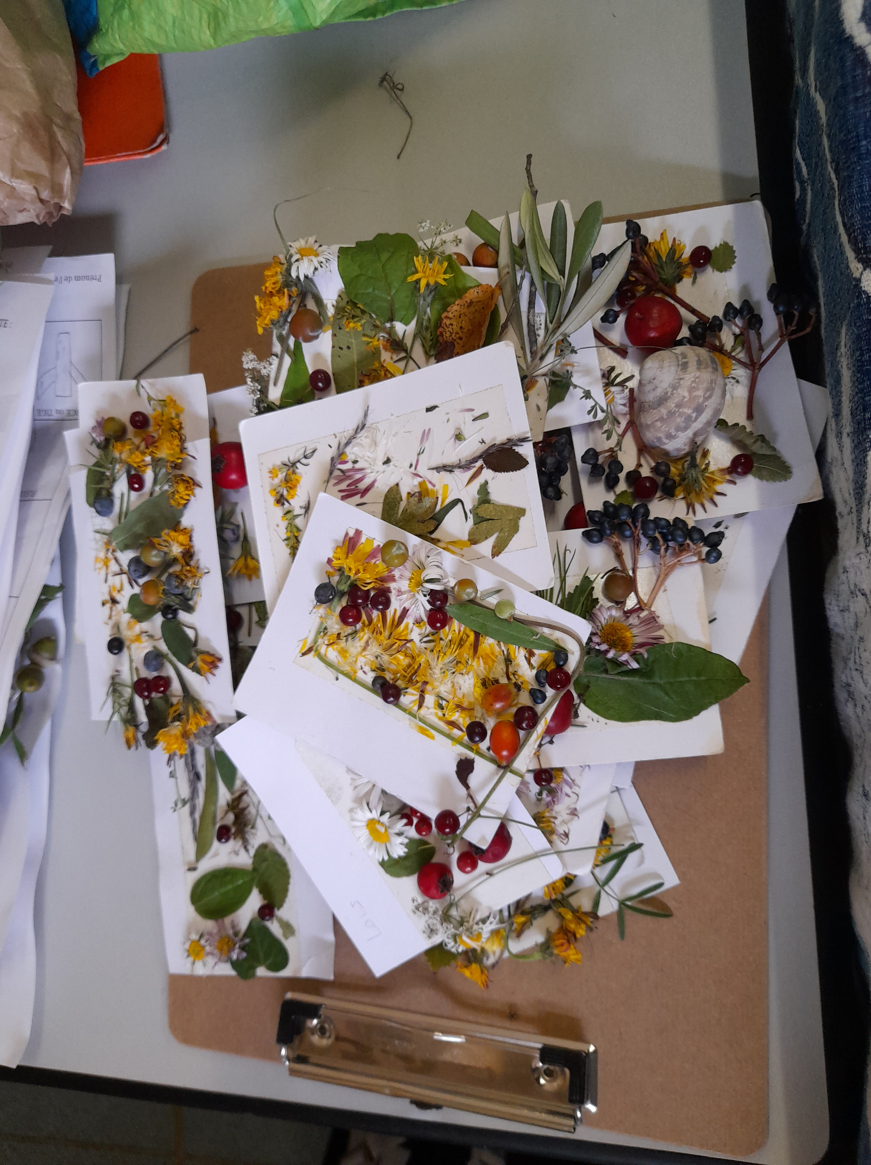 - La chasse aux plantes ; en 4 groupes, les élèves partent (dans une atmosphère bien joyeuse) trouver dans la nature des éléments précités, puis rassemblement pour fixer leurs récoltes sur une feuille et en dessiner les différents éléments (feuille, tige, fleur, fruit …).