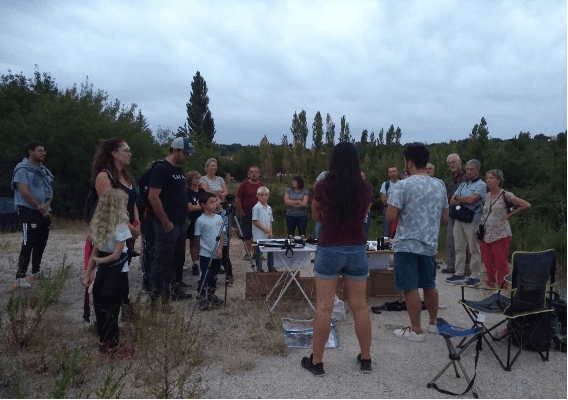 À 20h30, chemin des vignes À Beaulieu, 22 adultes et 7 enfants étaient présents. Les deux animateurs, Jules Teulières et Aurélia Dubois, avaient installé leur matériel, des photos, des ouvrages spécialisés et des peluches de chauve-souris sur deux tables de camping au point haut de la station de relevage.