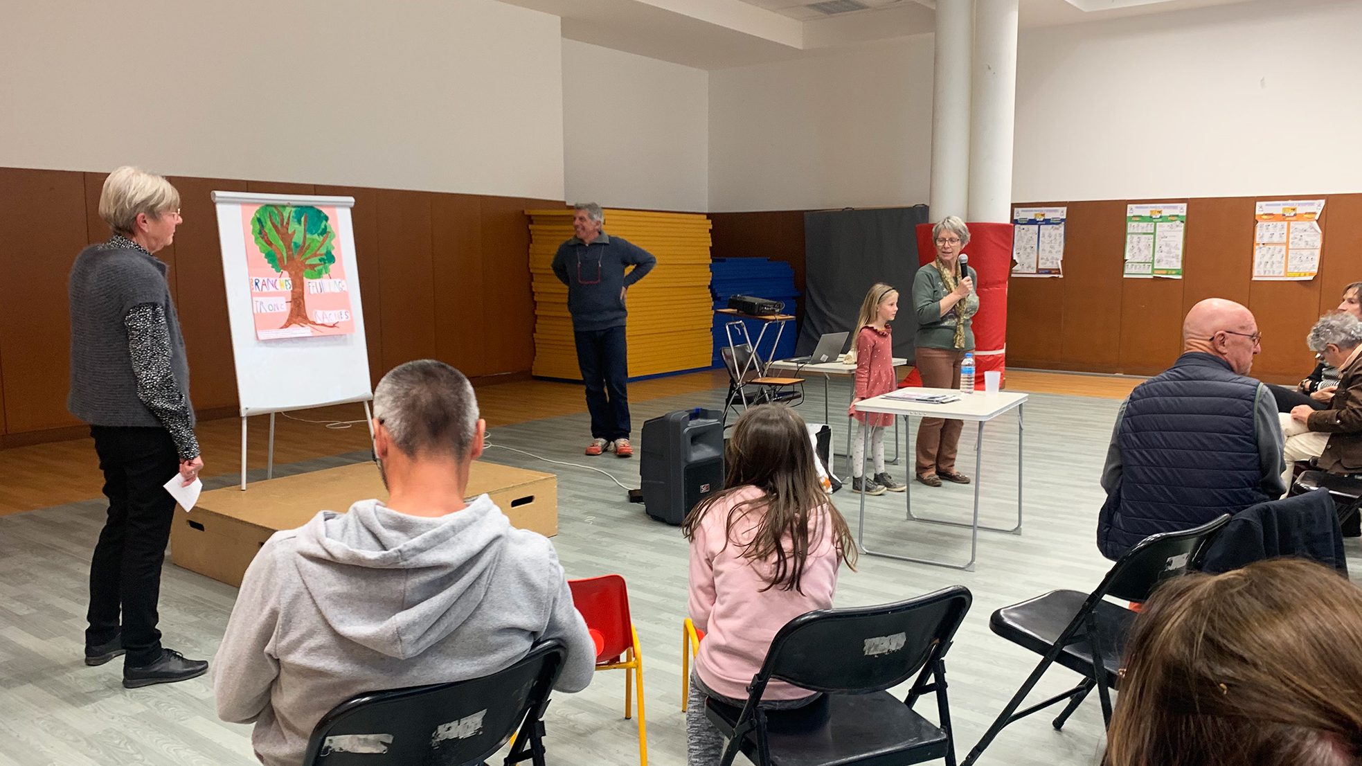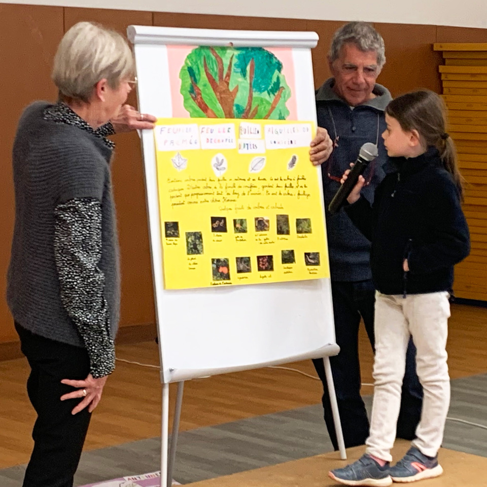 La soirée a débuté avec la présentation par deux élèves du cours préparatoire d’Isabelle Vaxelaire de l’école primaire de Beaulieu des travaux réalisés dans le cadre scolaire qui font suite à trois jours de sorties nature. Les deux fillettes sont assistées par Catherine Fels, en charge des relations avec les écoles, et par Yves Caraglio, le référent scientifique d’A.R.B.R.E.