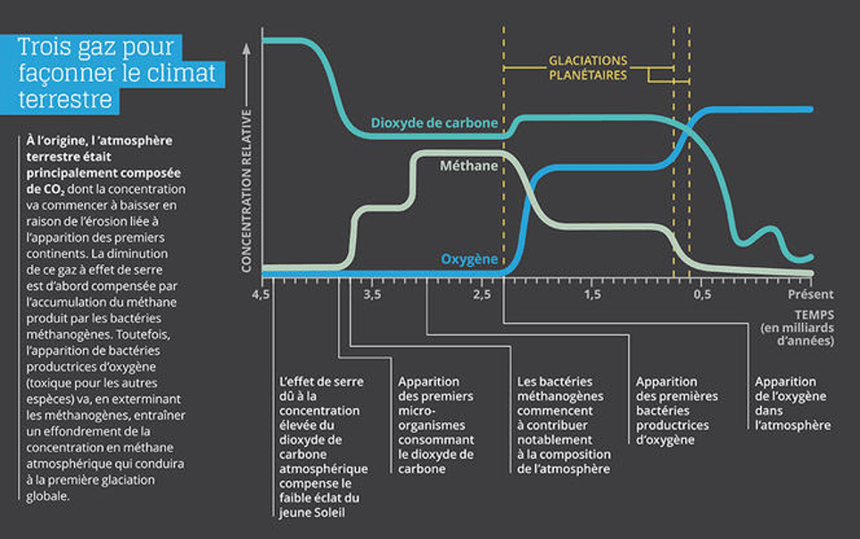 Avec beaucoup de CO2 dans l’atmosphère on aurait dû avoir un effet de serre énorme mais le soleil n’était pas à pleine puissance (environ 70%). La vie autour de – 4 milliards d’années concernait des organismes unicellulaires qui absorbaient de l’oxygène et rejetaient du méthane. Ce gaz à effet de serre sont 25 fois plus puissants que le CO2. Les températures auraient dû exploser. Il y eut semble-t-il un brouillard d’hydrocarbures (du méthane) qui a assuré une protection. De fait il n’y a pas qu’une cause et qu’une conséquence. Il y a un peu plus de 2 milliards d’années, une énorme glaciation transforme la terre en une énorme boule de neige. Grace à la prolifération d’une nouvelle catégorie d’organismes utilisant la photosynthèse, l’oxygène apparaît. Cet oxygène est un poison pour les premières formes de vie. C’est probablement la première extinction mais qui reste ignorée. Il y a 750 millions d’années, la concentration atmosphérique de gaz à effet de serre baisse à tel point que la Terre a perdu environ 50 °C de température moyenne. La cause en est probablement : l’érosion… Les sédiments sont des puits à carbone qui captent le CO2. Plusieurs épisodes ont eu lieu jusqu’à – 600 millions d’années environ et on en est sorti grâce au volcanisme qui a rejeté du CO2…