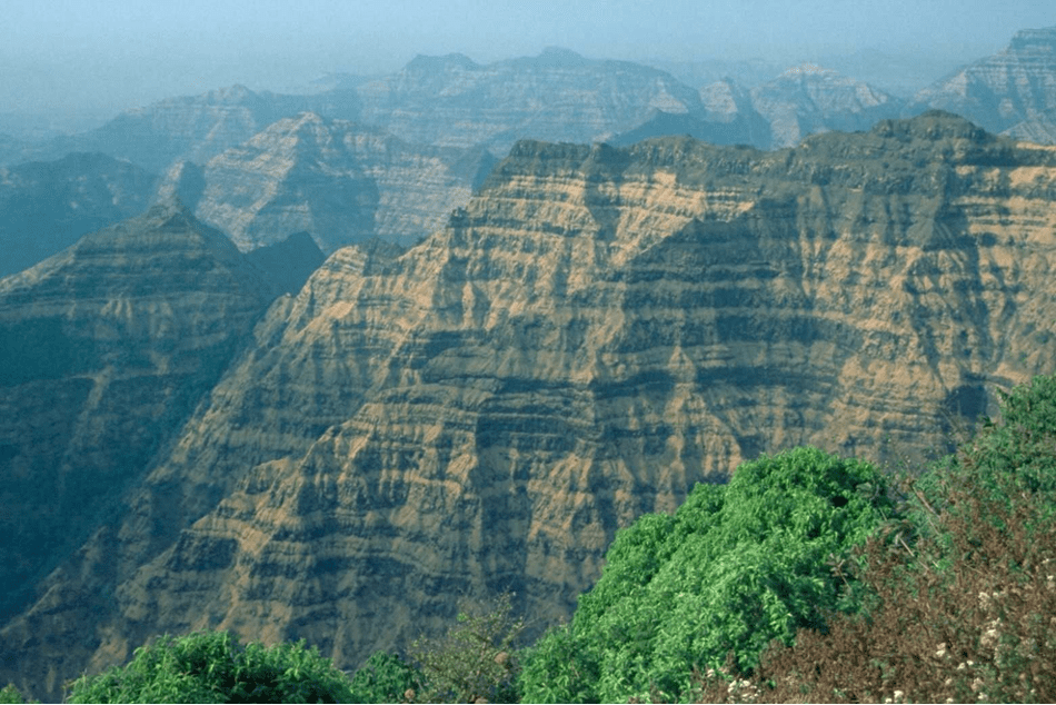 Trapps du Deccan formés à la suite d’importantes coulées de lave de plus de 2 000 m d’épaisseur sur 1,5 à 2 million de km², entre 30 000 ans et 1 million d’années, à l’époque où la plaque Indienne, qui avait quitté le sud de l’Afrique, se trouvait au niveau de la Réunion actuelle.
