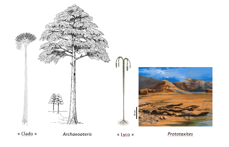 des arbres Poteau chez les Cladoxylopsida que nous nommerons « Clados ». Les spécimens les plus emblématiques sont découverts dans l’état de New York aux USA où ils forment une forêt à Gilboa. Ces arbres n’ont pas de feuilles et peu de bois.