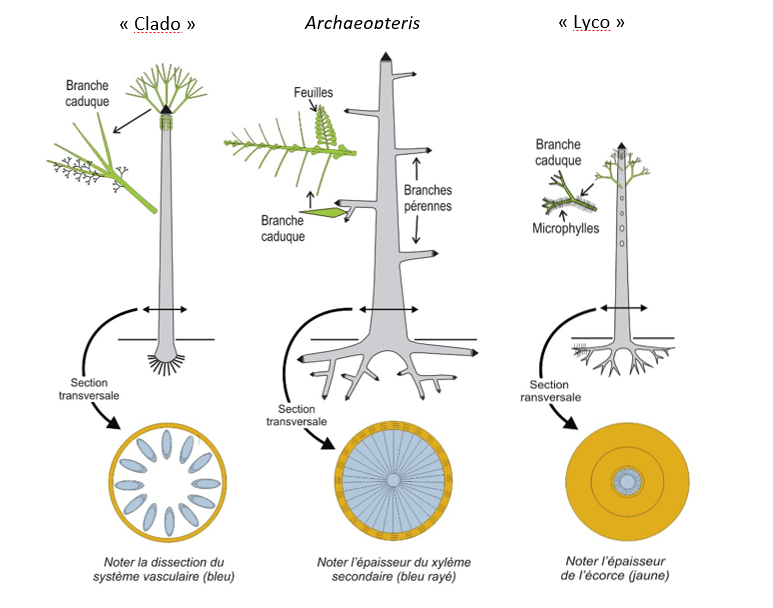 des arbres 3D chez Archaeopteris. Ces arbres ressemblent à des conifères actuels. On a récemment retrouvé des paléosols avec leurs systèmes racinaires très étendus à Gilboa où ils formaient des forêts à peu près contemporaines des précédentes. Ces arbres ont des feuilles et beaucoup de bois.