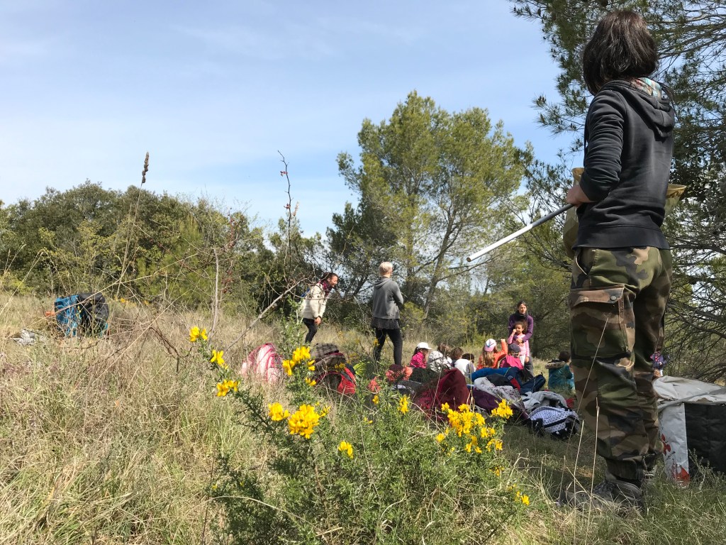 Petit chemin derrière l’école, la classe rejoint l’espace verdoyant prévu pour passer la journée, accompagnée de la maîtresse, Emilie, trois Papas et moi-même.