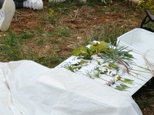Et pour terminer… deux équipes créent un « Land Art » avec tous les matériaux récoltés (fruits colorés, fleurs, feuilles, petites branches, cailloux, coquilles d’escargot …). Un enfant s’allonge sur le sol dans une position de son choix, et ses camarades le dessinent à l’aide de petites branches ou de cailloux, puis la silhouette est « remplie » avec les éléments récoltés précédemment. (Voir photos).