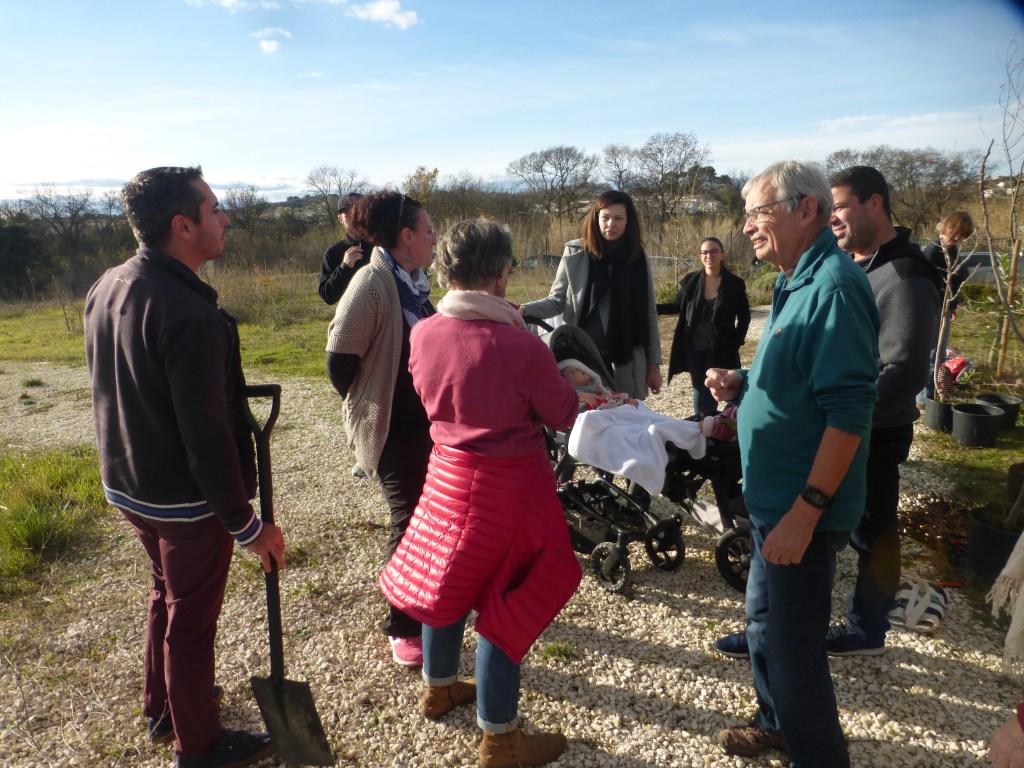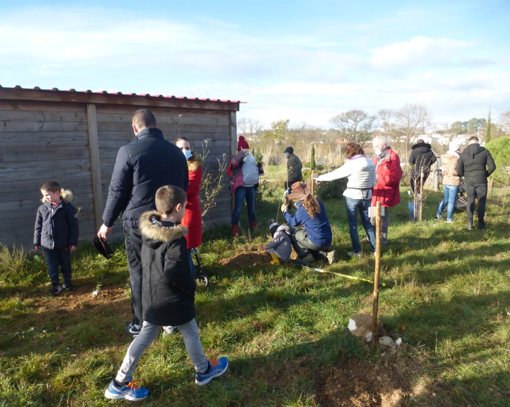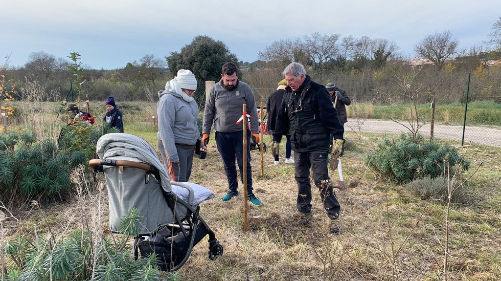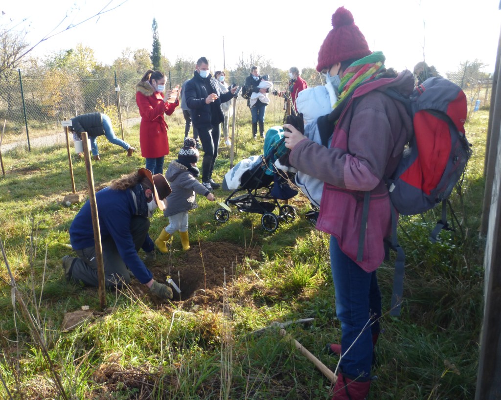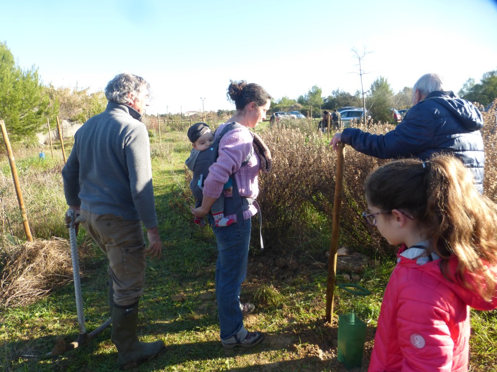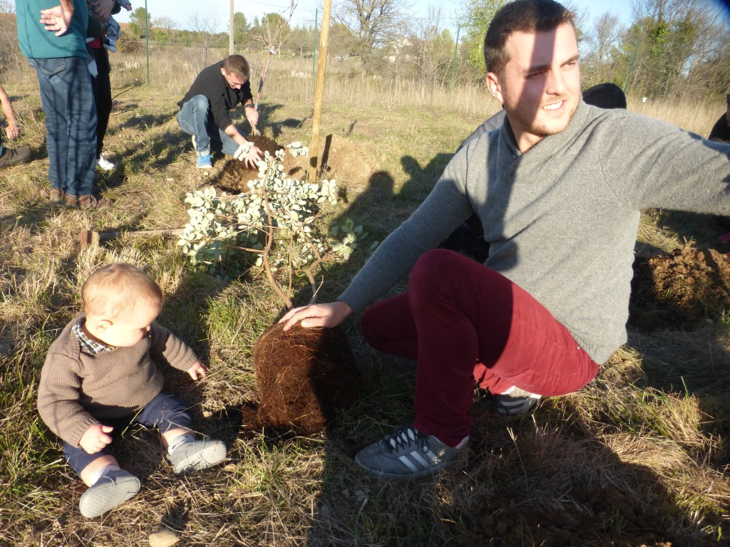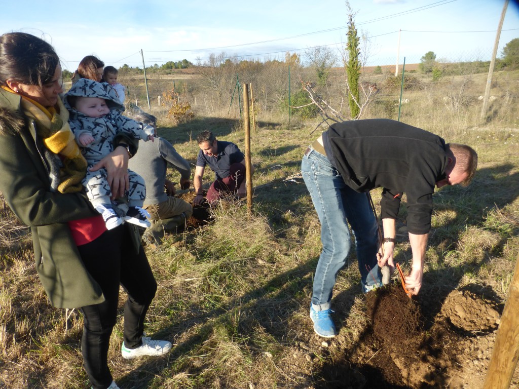 Le froid glacial du matin avait cédé la place à un temps plus clément avec de belles éclaircies. Munis de pelles et de pioches, les jeunes parents ont creusé les trous pour les arbres de différentes essences (plusieurs sortes de chênes, feijoa, noisetiers et bien d’autres) sous la supervision des bénévoles de l’association et du maire Geniès Balazun, venu les encourager. Les parents des petits triplés ont eu bien du mérite à creuser trois trous pour leur progéniture !