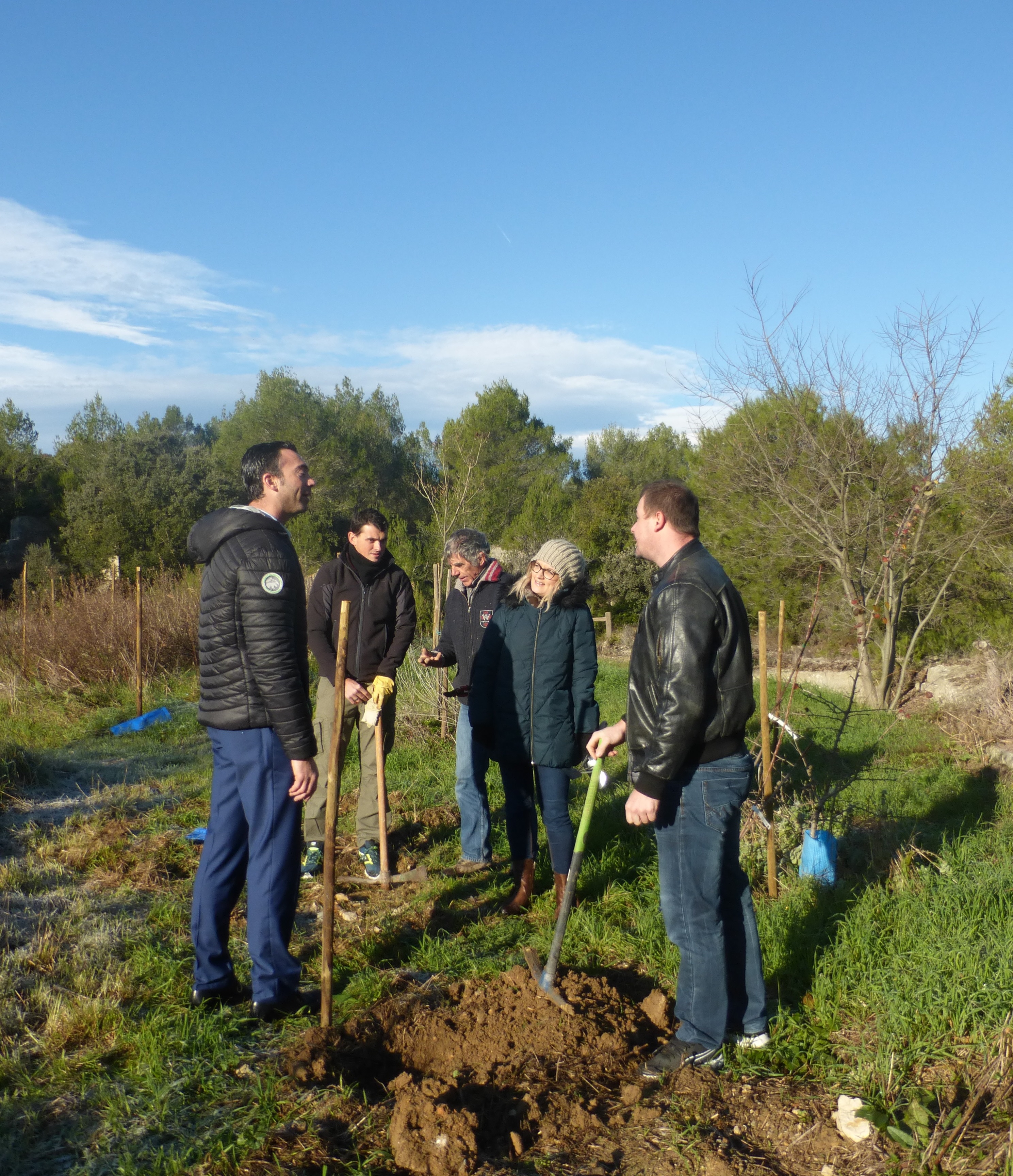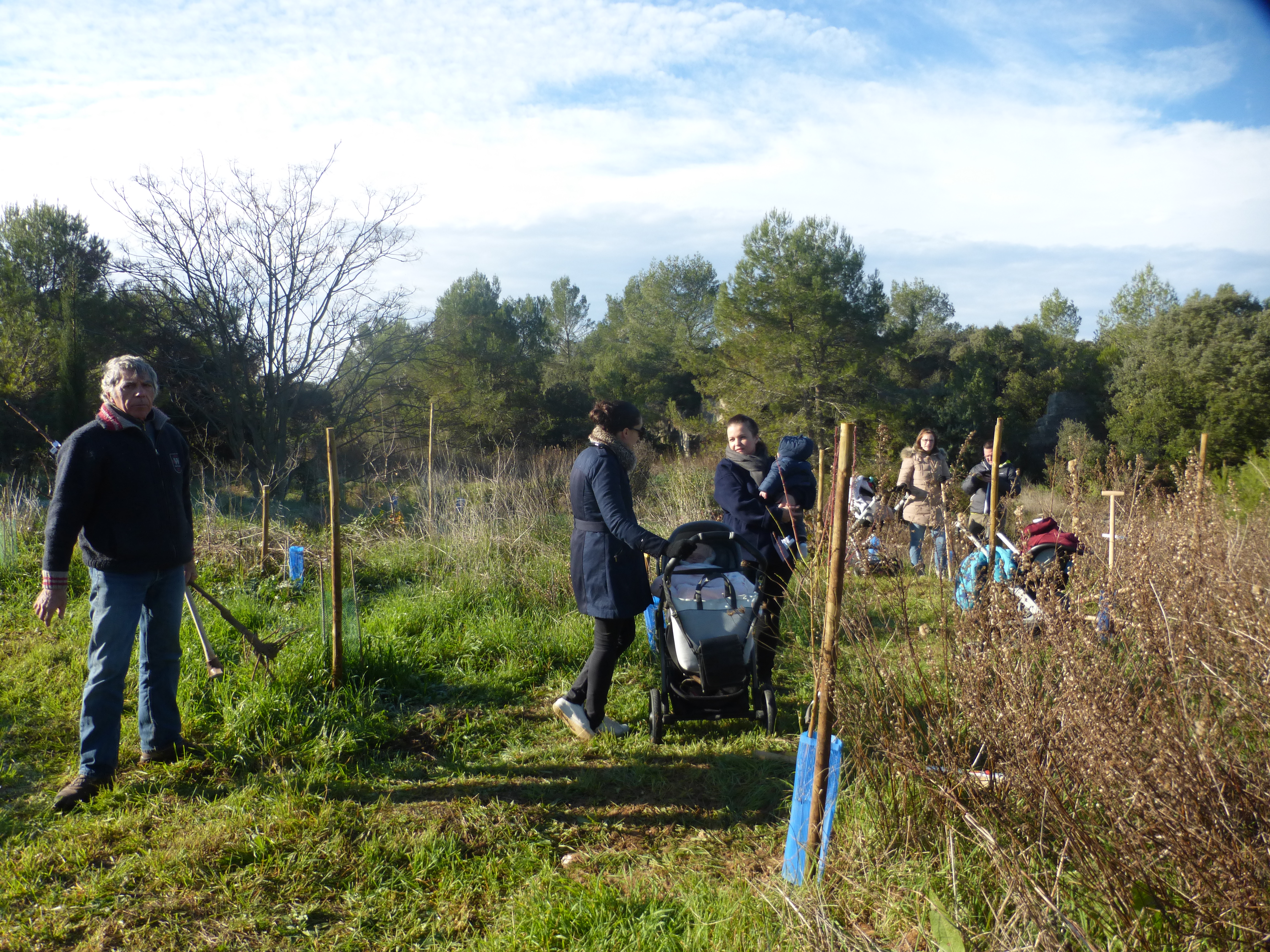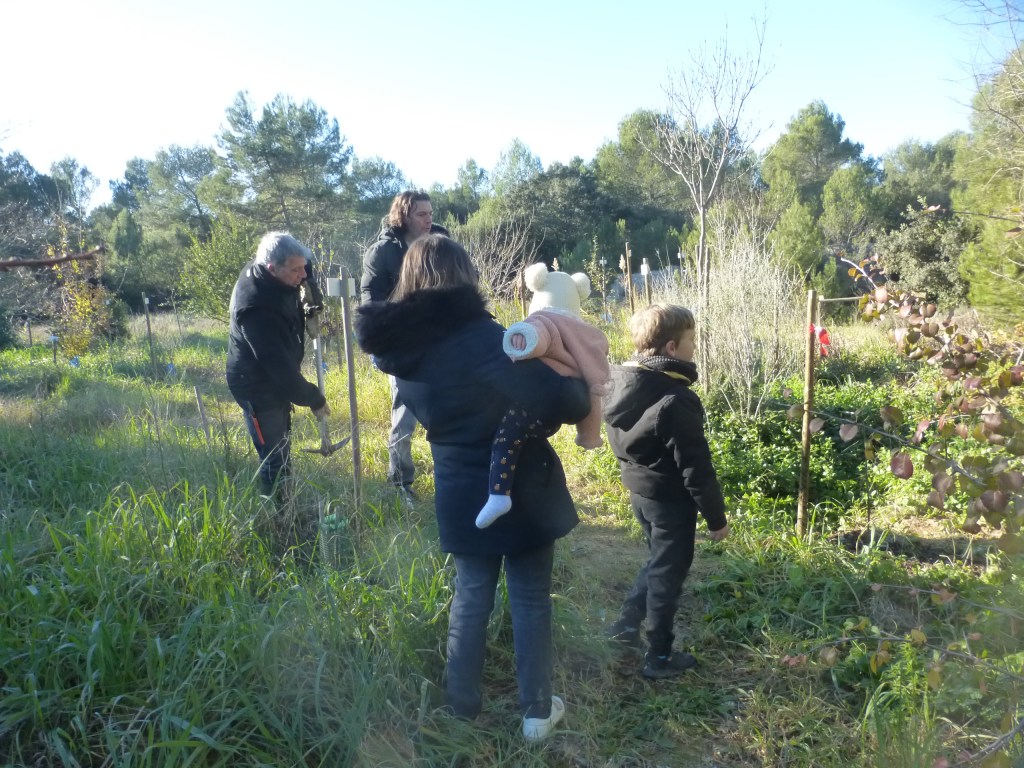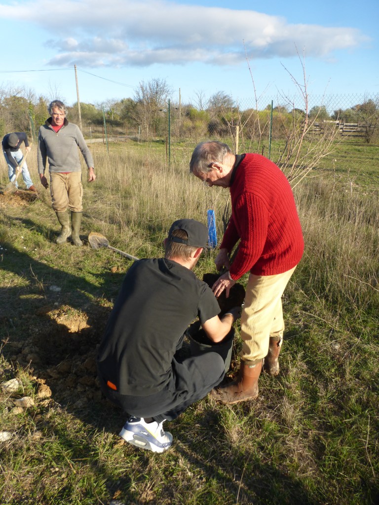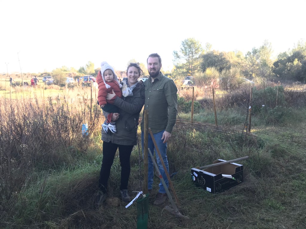 Le froid glacial du matin avait cédé la place à un temps plus clément avec de belles éclaircies. Munis de pelles et de pioches, les jeunes parents ont creusé les trous pour les arbres de différentes essences (plusieurs sortes de chênes, feijoa, noisetiers et bien d’autres) sous la supervision des bénévoles de l’association et du maire Geniès Balazun, venu les encourager. Les parents des petits triplés ont eu bien du mérite à creuser trois trous pour leur progéniture !