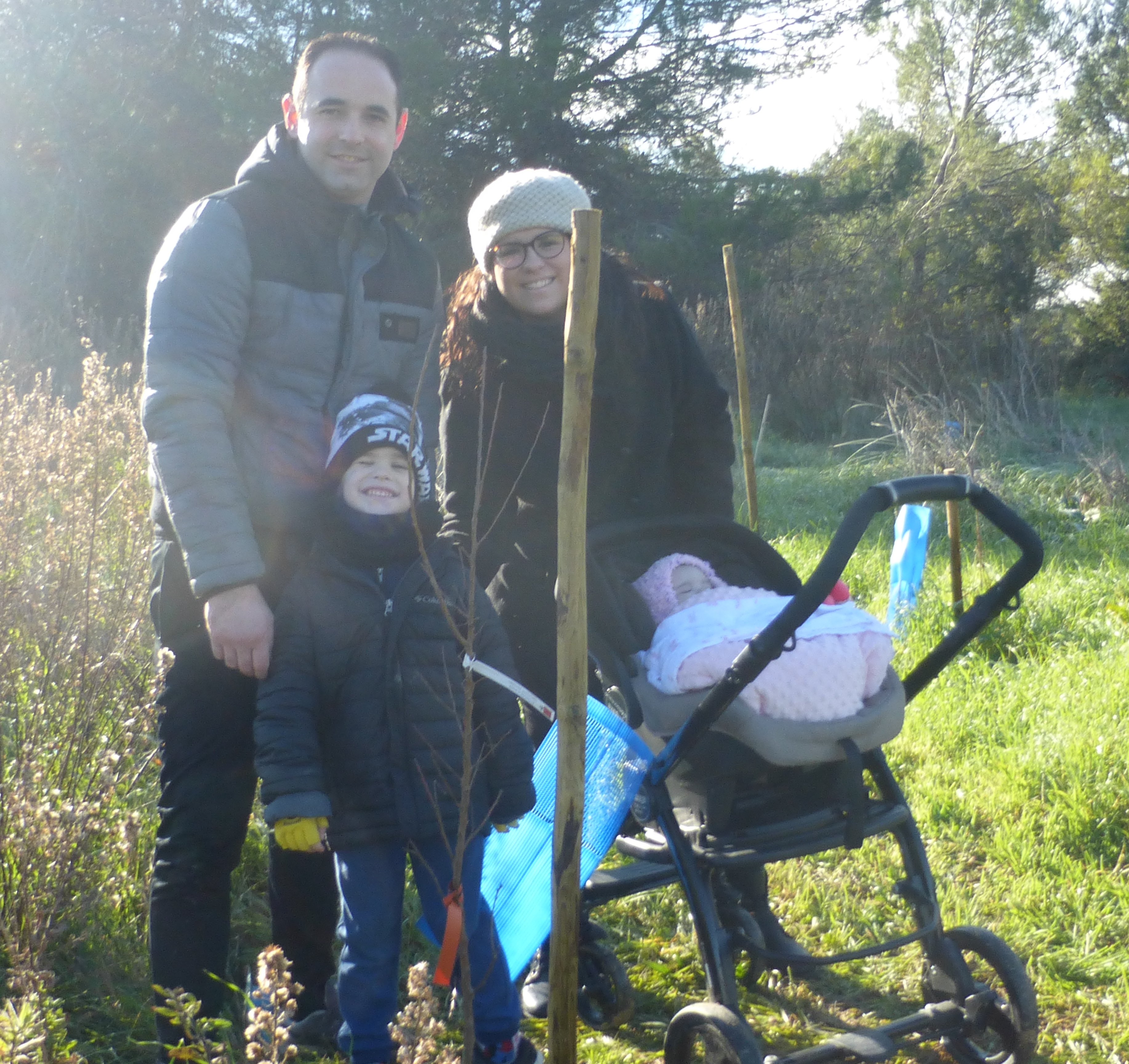 Comme chaque année à la même saison, l’association ARBRE avait donné rendez-vous aux parents volontaires pour planter un arbre à l’occasion de la naissance de leur enfant. 14 familles ont répondu positivement, 3 ont demandé que l’on plante les arbres en leur absence et finalement 5 familles étaient au rendez-vous dimanche après-midi. Le soleil était présent aussi, ce qui fut bien agréable compte tenu des basses températures en cette période de l’année.