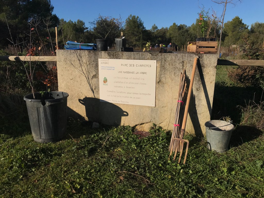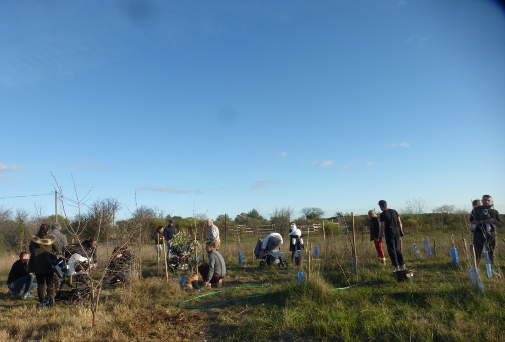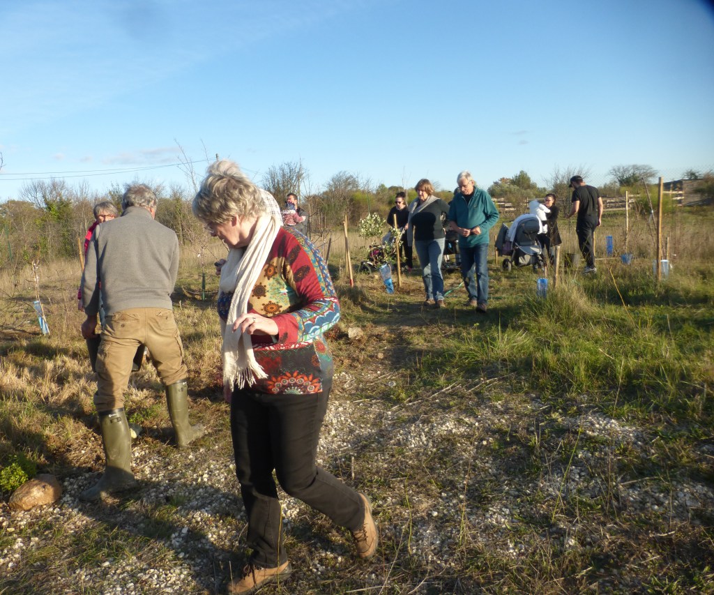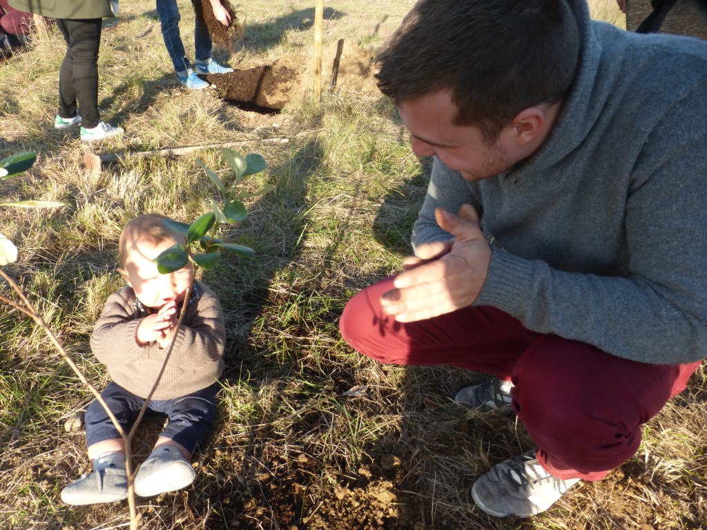 À Beaulieu les plantations ont eu lieu le dimanche matin avec une bonne douzaine de variétés telles que : Cudrania, Platane, Cormier, Sorbier, Grenadier, Arbousier, Argousier, Houx, Pinsapo, Toona, Erhetia, Cytise… Nous avons accueilli les jeunes parents et les bébés de l’année et parfois aussi les grands-parents venus donner un coup de pioche. Les avant-trous avaient été préparés par des bénévoles de l’association pour permettre une plantation plus aisée.