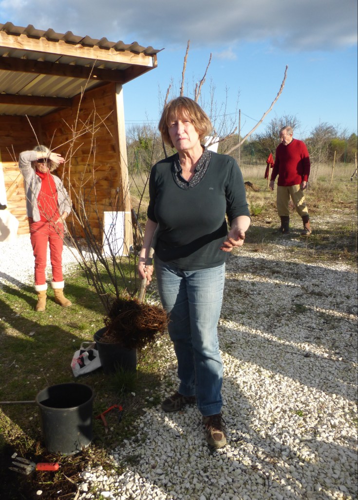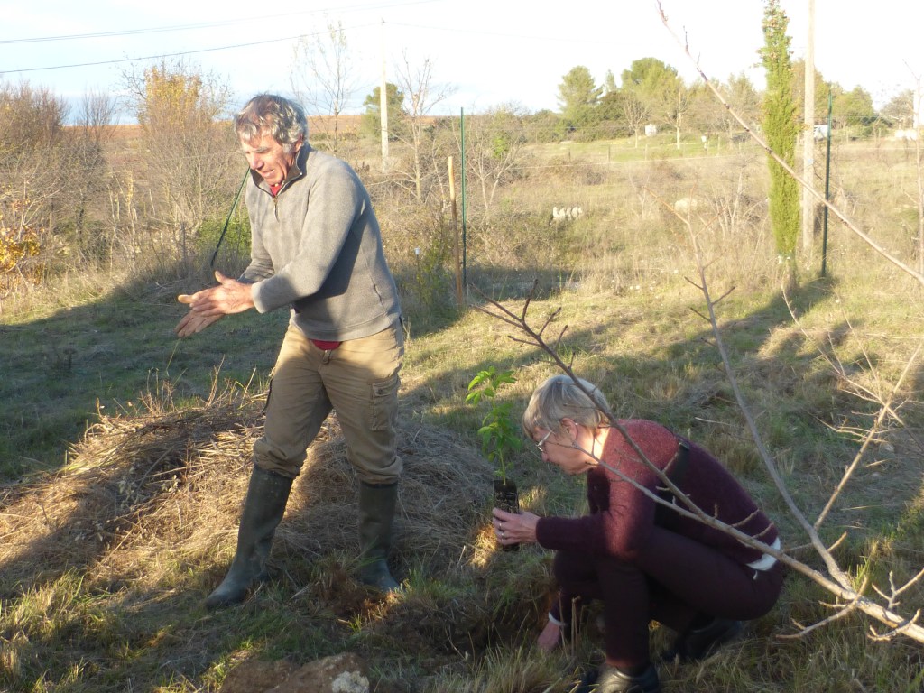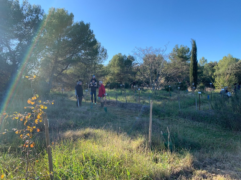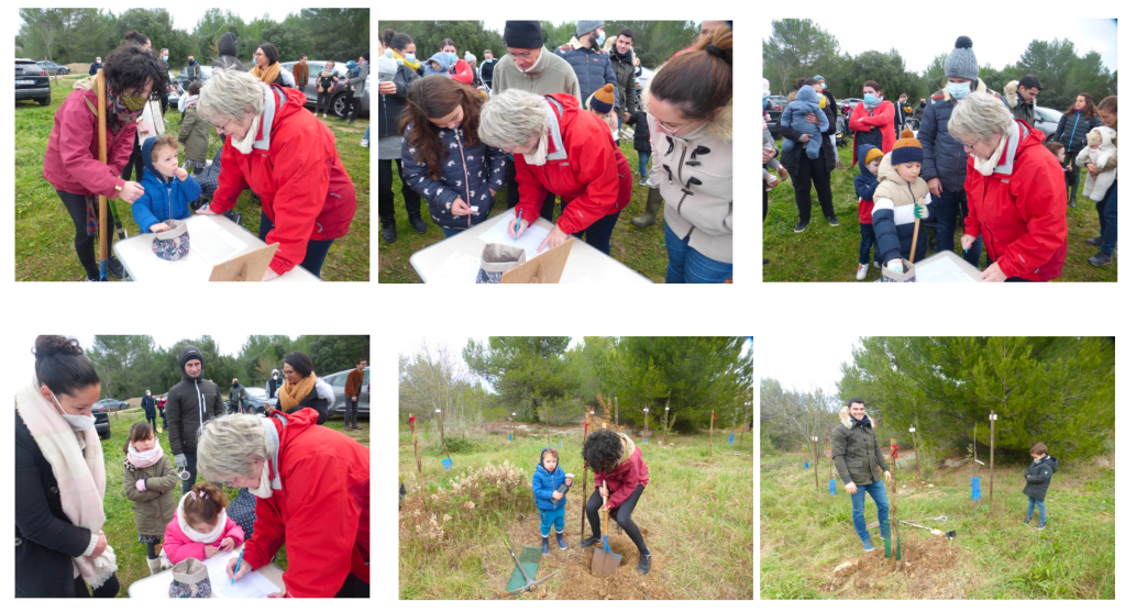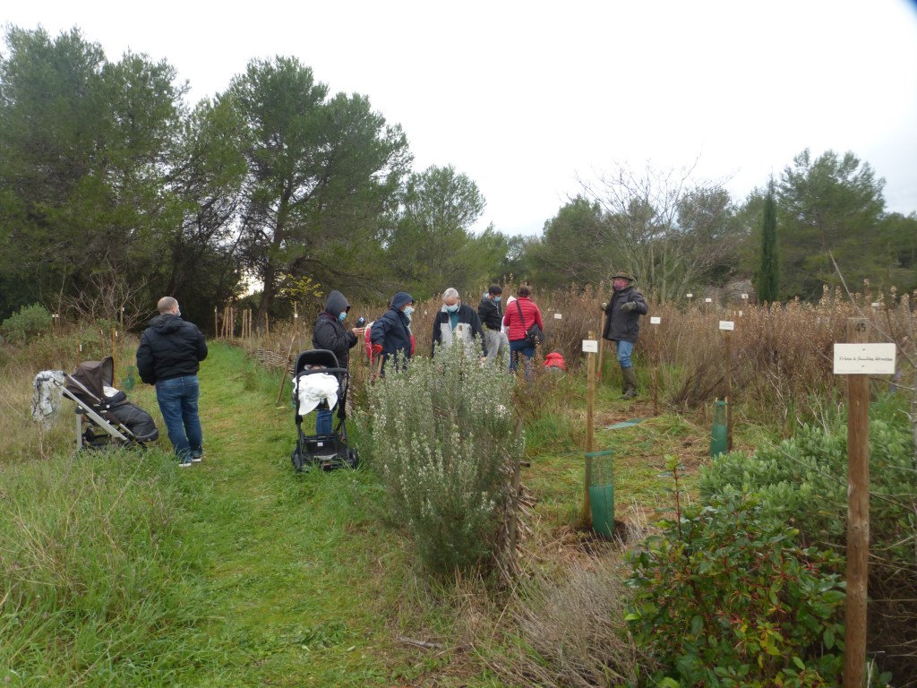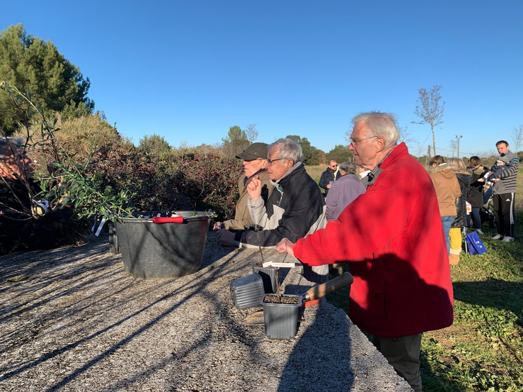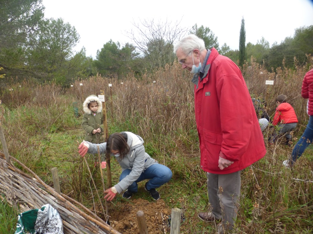 Comme toujours, les arbrisseaux principalement choisis par Yves Caraglio, notre référent scientifique (botaniste au CIRAD) sont des espèces bien adaptées au climat de notre région. Sa collègue Claire Atger, Docteure en botanique, chargée d’études à Pousse Conseil, spécialiste des systèmes racinaires, remettait les arbres aux familles avec les explications nécessaires à leur installation réussie.
