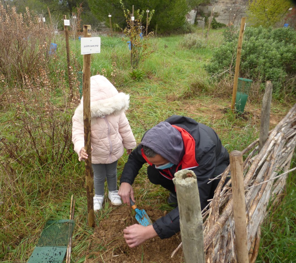 A l’aide de pioches et de pelles et après le traditionnel tirage au sort, les jeunes parents ont planté un cerisier bigarreau, un pommier d’ornement, un prunier « valor », un érable champêtre, un néflier sauvage et un olivier, sous le regard attentif et les conseils de Claire Atger, spécialiste du système racinaire, et d’Yves Caraglio, botaniste au Cirad.