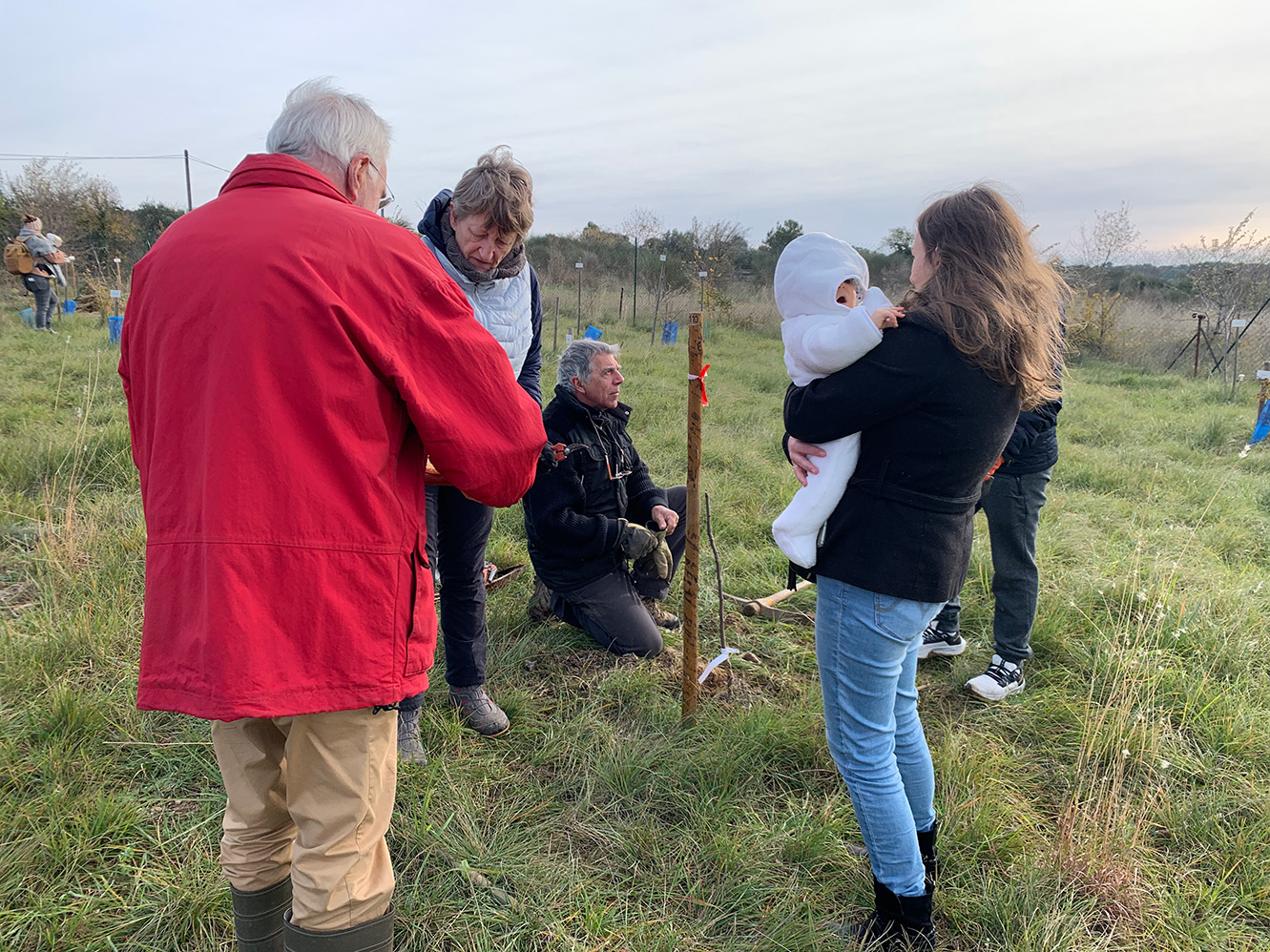 Yves Caraglio le botaniste, Jean-Paul Taillandier le responsable des parcs et François Bertin un des fondateurs de l’association, étaient présents pour aider les planteurs. La matinée a commencé par le tirage au sort des jeunes pousses puis chacun a rejoint l’emplacement numéroté pour procéder à la plantation.