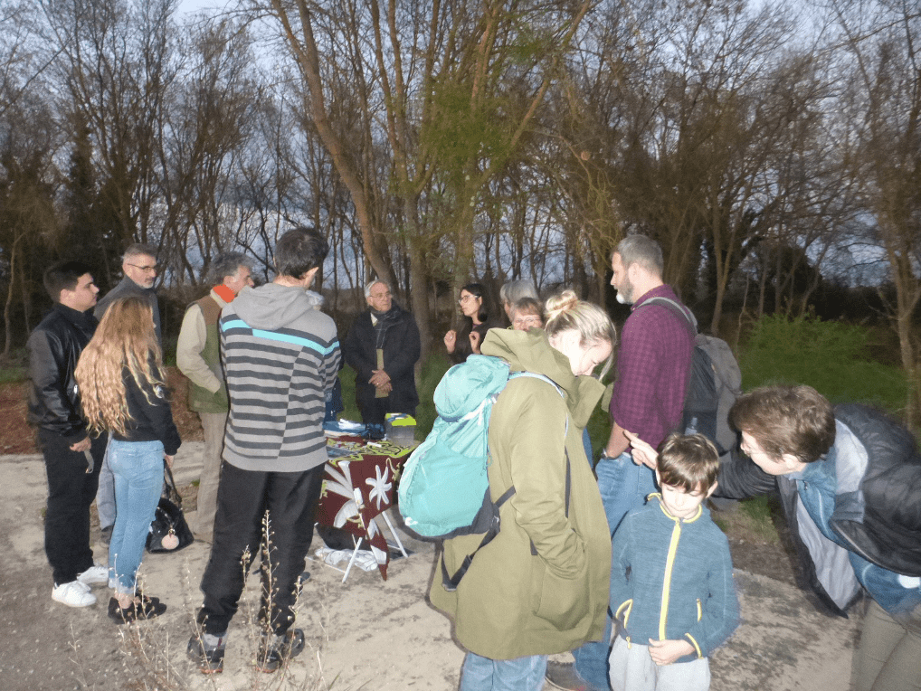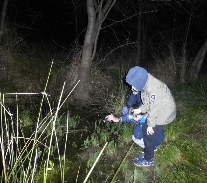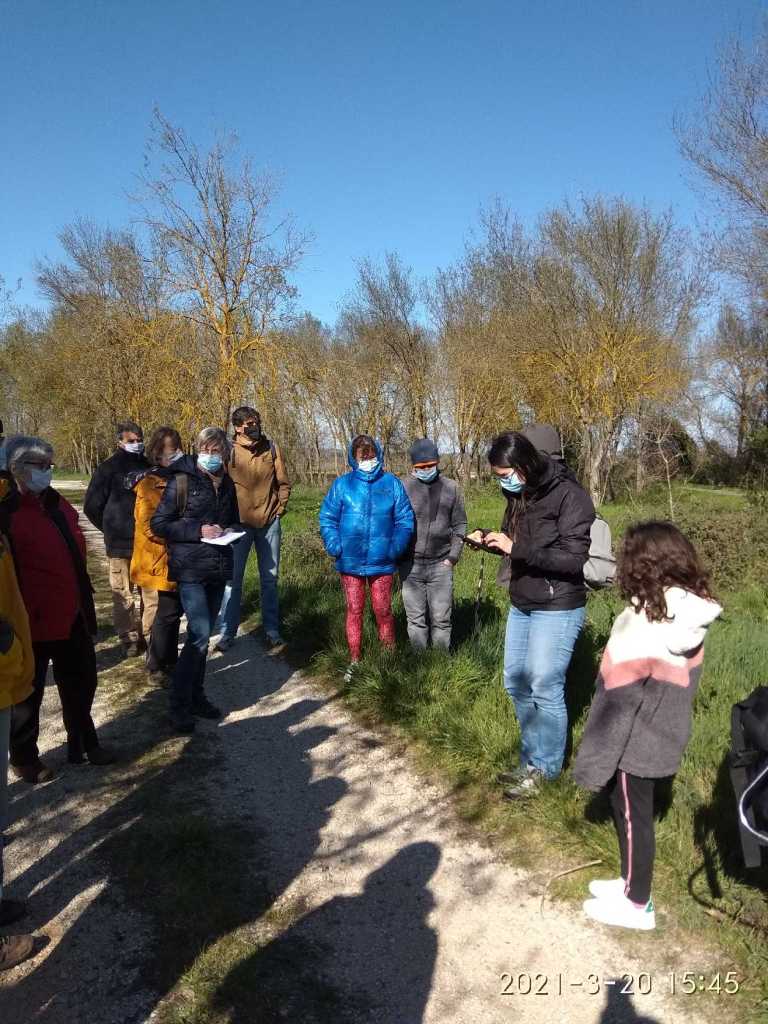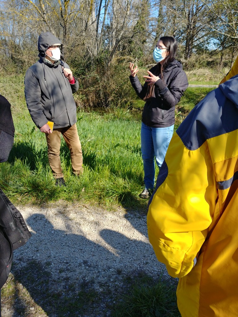 La sortie amphibiens programmée initialement le 9 mars a été reportée en raison d’une météo pluvieuse, très appréciée des grenouilles, mais un peu moins du public. Samedi 23 mars, Aurélia, technicienne en environnement, spécialisée en herpétologie (reptiles et amphibiens), nous accueille à 18h30 à l’ancien lagunage dans la plaine de Beaulieu, à proximité d’une mare naturelle et de la Gendarme, un modeste affluent de la Bénovie. Depuis quelques années, nous devons renoncer au site des carrières de Beaulieu, faute d’eau. Onze personnes sont présentes dont une fillette qui acceptera d’épauler Aurélia dans la recherche des petits habitants de la mare. Le vent contribue à rafraîchir l’atmosphère et hâtera notre balade autour de la mare et de la Gendarme.