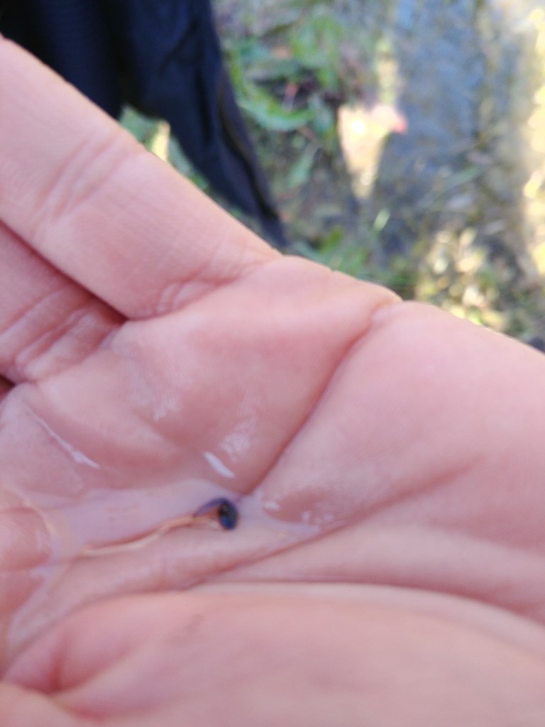 Aurélia identifie un triton palmé et quelques têtards de Pélodyte que l’on peut admirer. On se déplace ensuite au bord de la Gendarme où l’on pourra admirer plusieurs Grenouilles rieuses caractérisée par une ligne verte sur le dos, de grandes pattes et une tête fine. Après avoir joué la star elle nous quitte vers d’autres lieux connus d’elle seule.