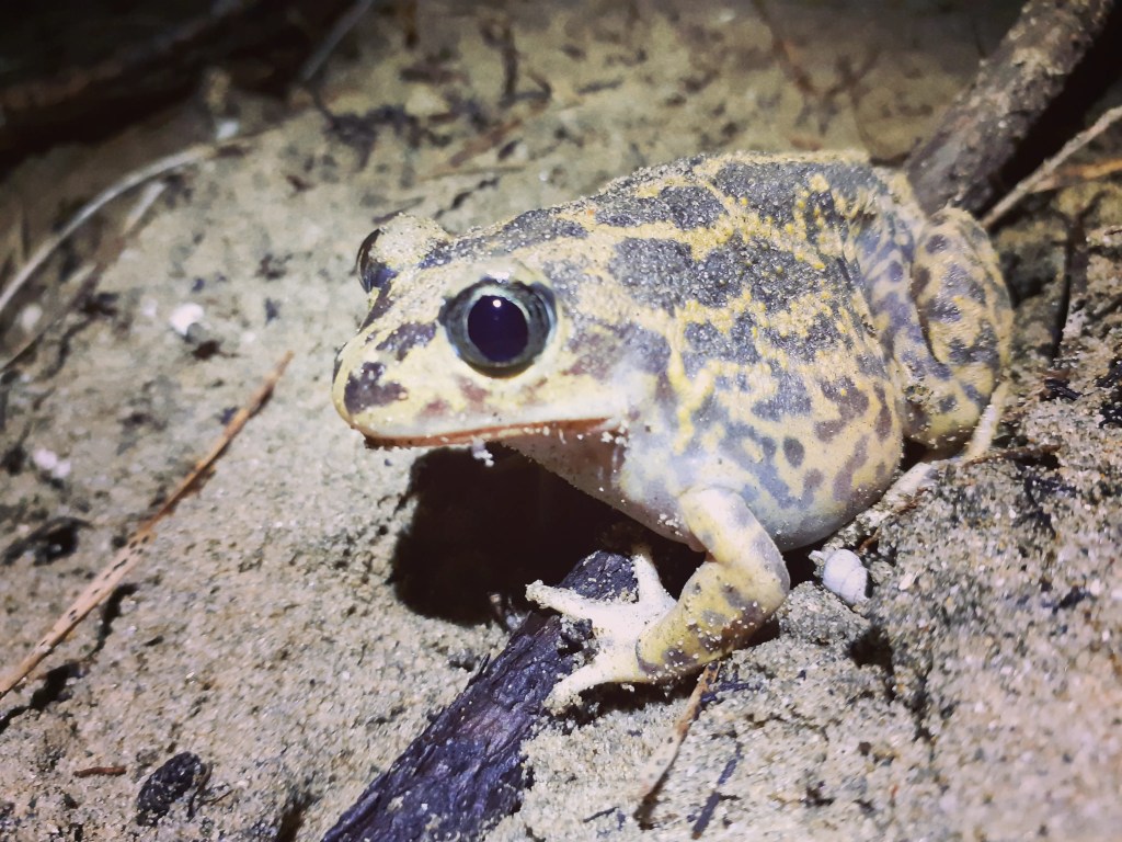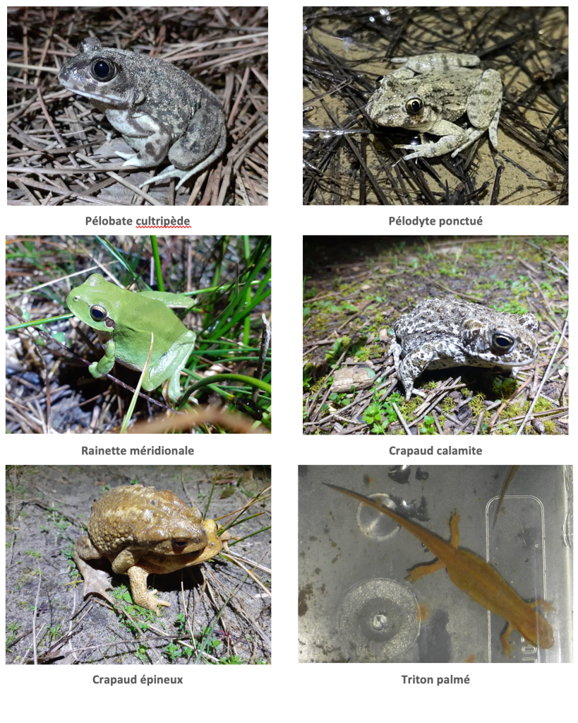 - Le Pélobate cultripède présent dans d’autres communes. Il a un chant qui rappelle celui d’une poule.