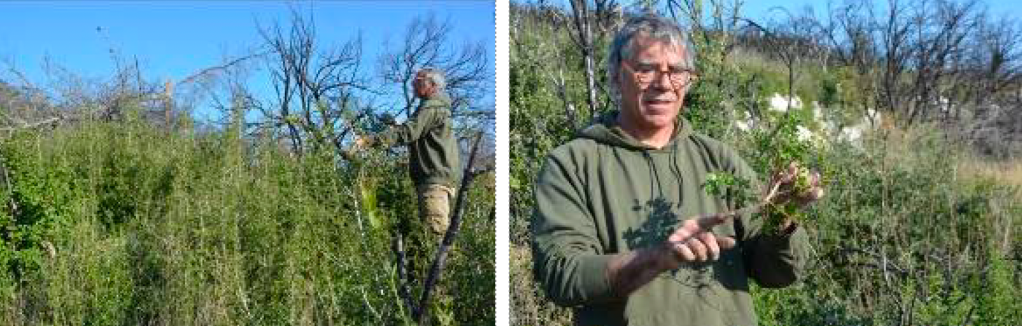 Devant une filaire buissonnante, Yves observe que les repousses ne sont pas en surface. Il gratte le sol et met à nu des racines enfoncées à 5 cm l Le système est très efficace. C’est la même stratégie qu’après une sécheresse. Il trouve que c’est une belle croissance en deux ans et qu’il n’y a pas eu de mortalité violente.