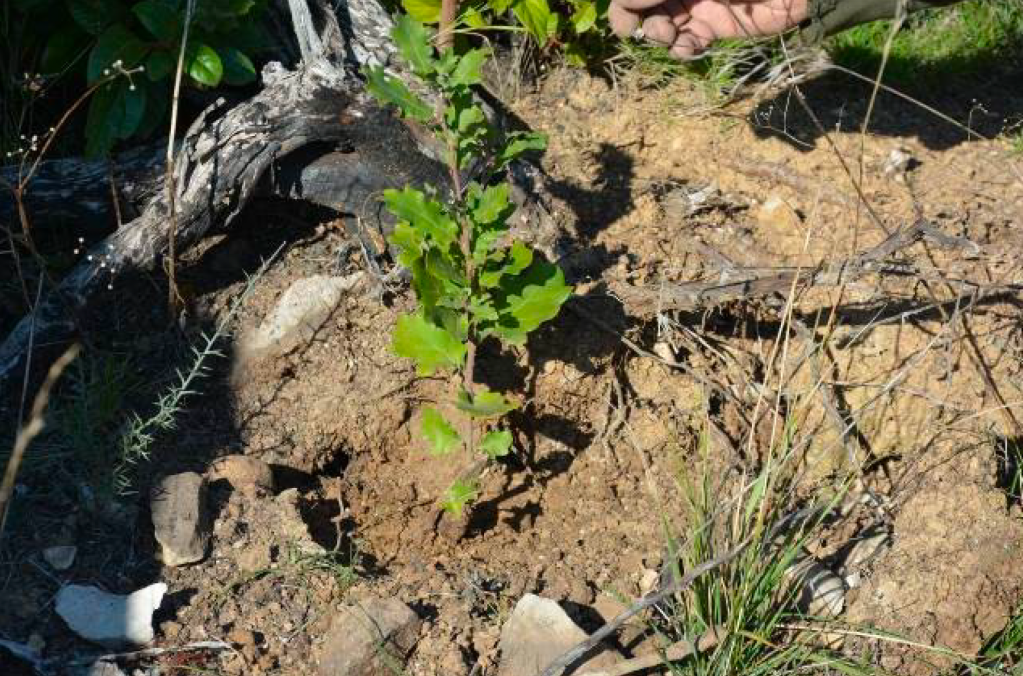 Les lentisques et les oliviers font leur germination et rapidement au niveau des toutes premières feuilles se développent des petits renflements qui constituent des réserves en formant un tubercule ligneux à la base du futur tronc et permettent à la plante de se régénérer après une sécheresse ou un incendie. Ici le cas d’un chêne blanc qui repousse à partir de la base de la tige d’origine enfouie dans le sol.