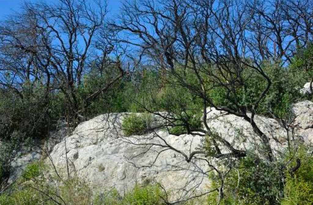Le chêne vert massivement présent en garrigue repart de la souche grâce à son système racinaire. Mais ici pour cet individu il ne s’est pas mobilisé car le feu a été trop intense alors il meurt sur pied. Il n’y aura pas de régénération.