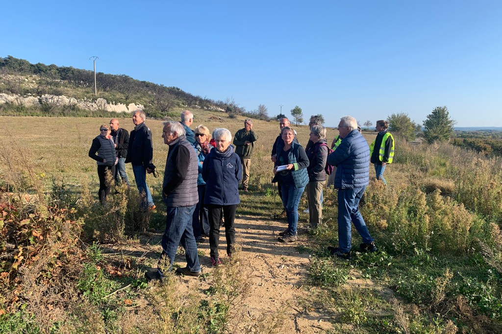 Pédagogue à souhait, Yves nous explique qu’après un épisode de cette ampleur, on a souvent le réflexe de procéder à un abattage des arbres brûlés et à leur évacuation. Ici rien n’a été fait. Cela va nous permettre d’observer la manière dont la nature a réagi. Nous longeons la faille qui avait fait l’objet d’une observation avec Dominique Gayte, géologue de formation, lors d’une sortie le 13 octobre 2019. Nous sommes en présence d’une végétation de garrigue avec une forte densité de chênes verts. Le feu s’est déplacé avec le vent. Des îlots n’ont pas brûlé. Le pin d’Alep a adoré. Ses fruits ont libéré des graines sous l’effet de la chaleur qui se sont dispersées. Nous avons affaire à un colonisateur post incendie.