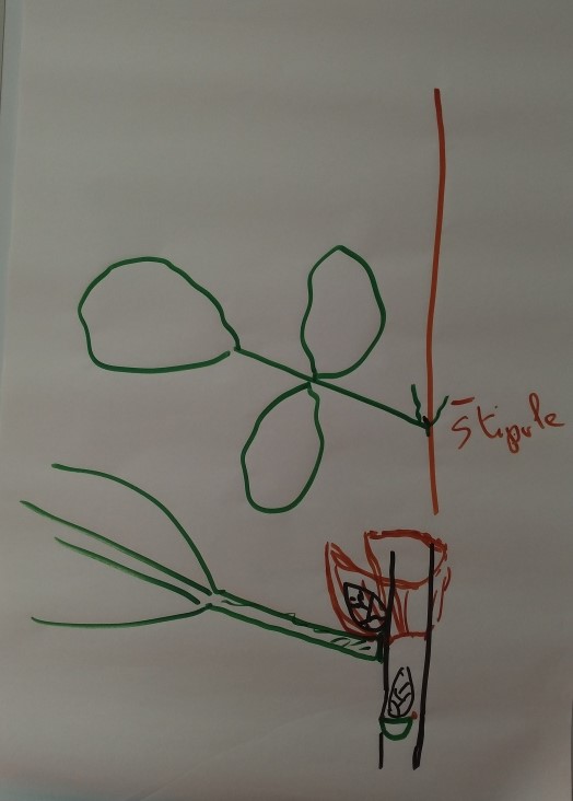 2 – Feuilles munies d’une ochréa. Petite membrane autour de la tige (stipules soudées)– chez l’oseille – famille des Polygonaceae.