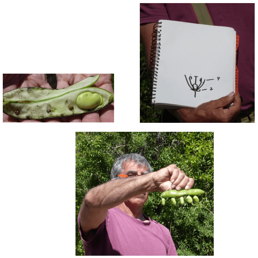 Yves continue la cueillette avec des petites poires. On retrouve les traces de la fleur dans la petite couronne composée de 5 pics –le calice, puis les traces des étamines-. Au centre, les pétales sont tombés. Yves dessine : l’ovaire est sous le calice mais ce n’est pas toujours le cas. Il coupe la poire en deux et nous invite à regarder l’intérieur : on voit comme des petites gouttes translucides, ce sont les feuilles carpellaires avec deux ovules par feuille. Ce que l’on appelle couramment « les pépins », ce sont les graines. Le fruit naît de l’épaississement de l’ovaire formé par l’ensemble des carpelles, ici pour la poire on dénombre 5 carpelles. Les poires sauvages font partie de la famille des rosacées.