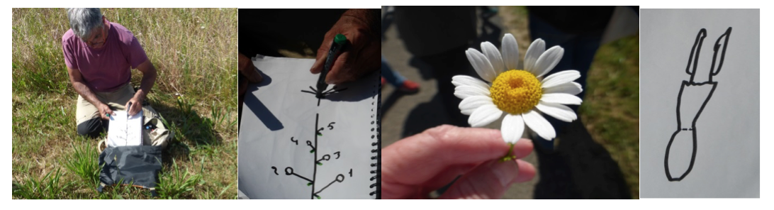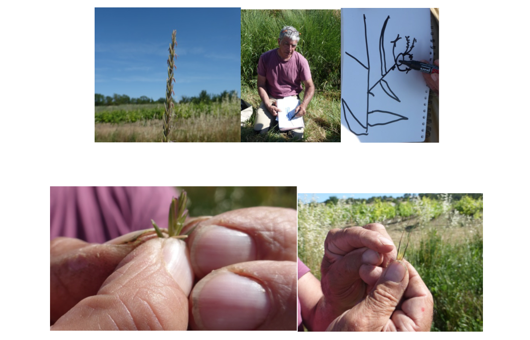 On se déplace un peu pour changer de registre avec une plante moins flashie qui appartient à la famille des céréales –les poacées ex. graminées-. Ces plantes ont des fleurs. Les fleurs ont du pollen. En les agitant on disperse le pollen. Yves fait un dessin. Les étamines sont à l’extérieur. Le vent est le pollinisateur. Pas besoin d’insecte. On distingue « le style » au sommet puis les stigmates. La fleur est simple. On ne la verra pas. Yves nous montre la partie qui constitue ce que l’on appelle le « son » de la folle avoine.