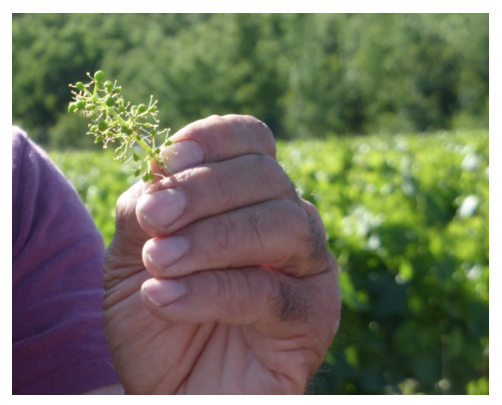 En longeant une petite vigne, Yves cueille une petite grappe qui est une inflorescence complexe. Chaque grain provient d’une fleur, on retrouve les traces de la fleur avec la présence des étamines au-dessous de chacun des petits fruits en formation.