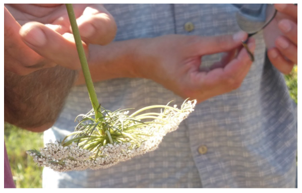Au tour de la fleur de la carottede passer à la loupe, composée d’un ensemble d’ombelles simples regroupées elle-même en une ombelle. Elle sent bon. Elle est proche de la fleur de la cigüe.