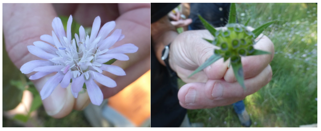 La scabieusevioletterappelle la marguerite avec une inflorescence contractée mais elle est différente : elle n’a pas de fleurs tubulaires, les étamines non soudées sont bleues. Elle produit de jolis fruits verts.