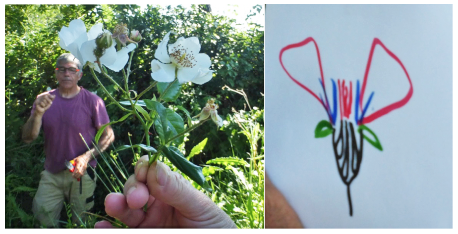 Yves cueille une petite branche fleurie. Il y a beaucoup d’étamines sur la fleur. On découvre que chaque partie verte correspond à une feuille carpellaire. Nous avons affaire à une ronce, rubus= la mûre. La partie dure de la mûre est attachée au carpelle. Chaque petit carpelle va grossir et donner un petit fruit qui va se coller à son voisin, et on mangera la mûre avec dans chaque petit fruit globuleux les graines. Le fruit est plus appétant que la graine qui sera ingérée par un oiseau et prédigérée puis rejetée dans ses excréments. La ronce fait aussi partie de la famille des rosacées. Dans cette promenade, nous sommes dans une démarche de vulgarisation qui consiste à simplifier des phénomènes plus complexes.