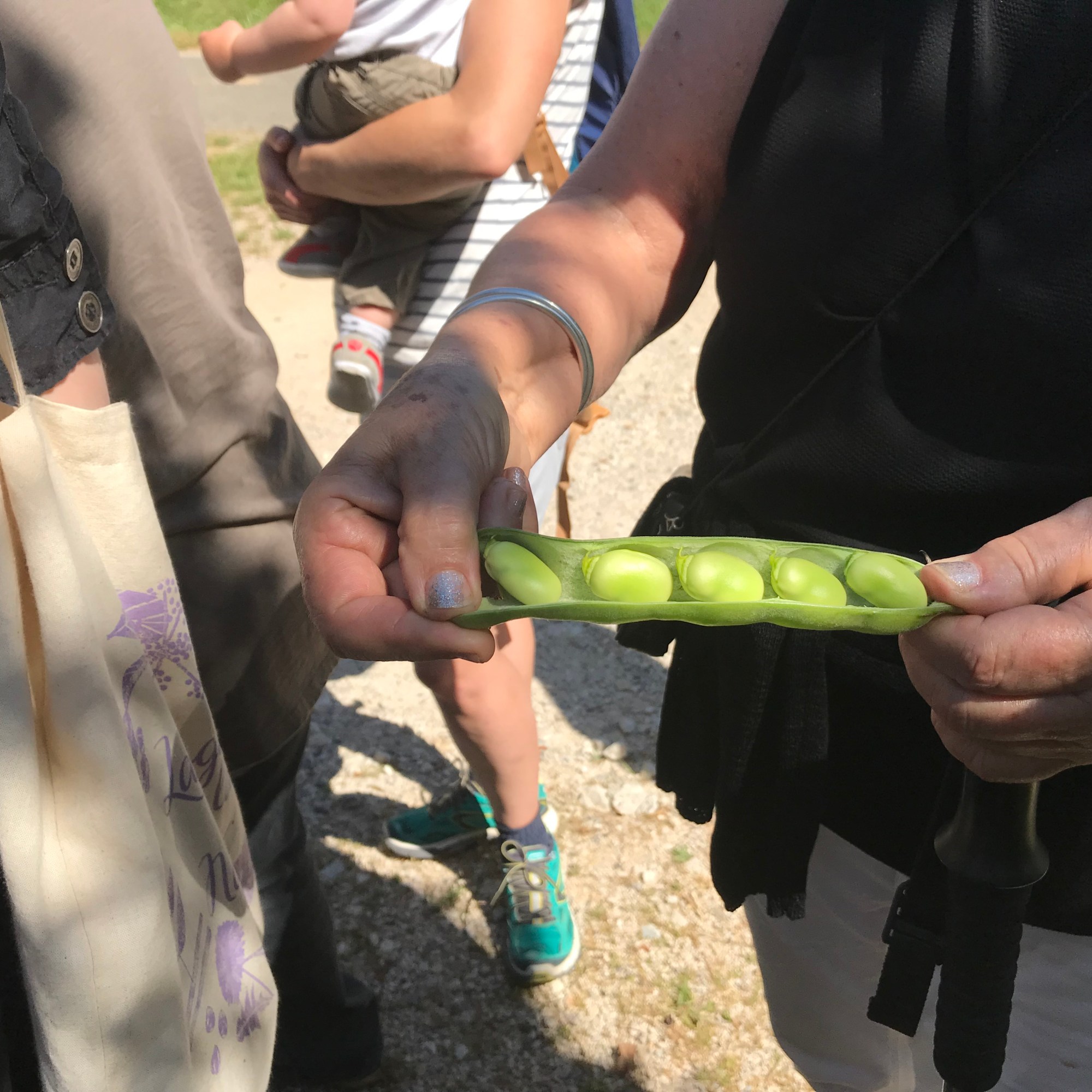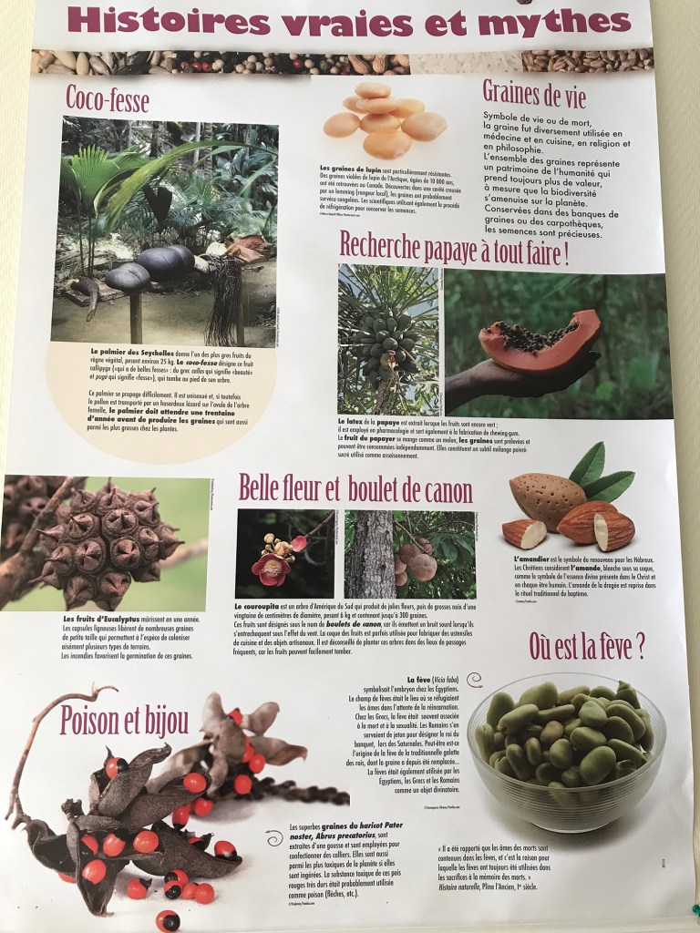 Yves a apporté plusieurs fèves. La feuille verte assure la photosynthèse sur la plante, il existe une feuille un peu particulière qui porte les ovules (qui permettront la formation des graines), on appelle cet élément la feuille carpellaire. Pour illustrer ce qu’est la feuille carpellaire, il suffit d’ouvrir une gousse de fève en deux : une lame verte (la feuille carpellaire) qui porte des ovules qui se sont transformées en graines. Cette feuille carpellaire s’est refermée sur elle-même enfermant les ovules à l’intérieur. La fleur comporte ainsi une ou plusieurs feuilles carpellaires que l’on appelle plus facilement un carpelle. La fleur comprend un ou plusieurs carpelles (de 1 à 5). On peut distinguer la ligne de soudure sur l’exemple de la fève (carpelle unique. L’ensemble des carpelles constitue l’ovaire. La fève va s’ouvrir sur les deux côtés –sur la ligne de soudure et sur la face opposée, le dos-. Les campagnols le savent eux qui ouvrent la fève sur le dos pour grignoter les graines des fèves bien suspendues grâce à des petits filaments, équivalents du cordon ombilical.