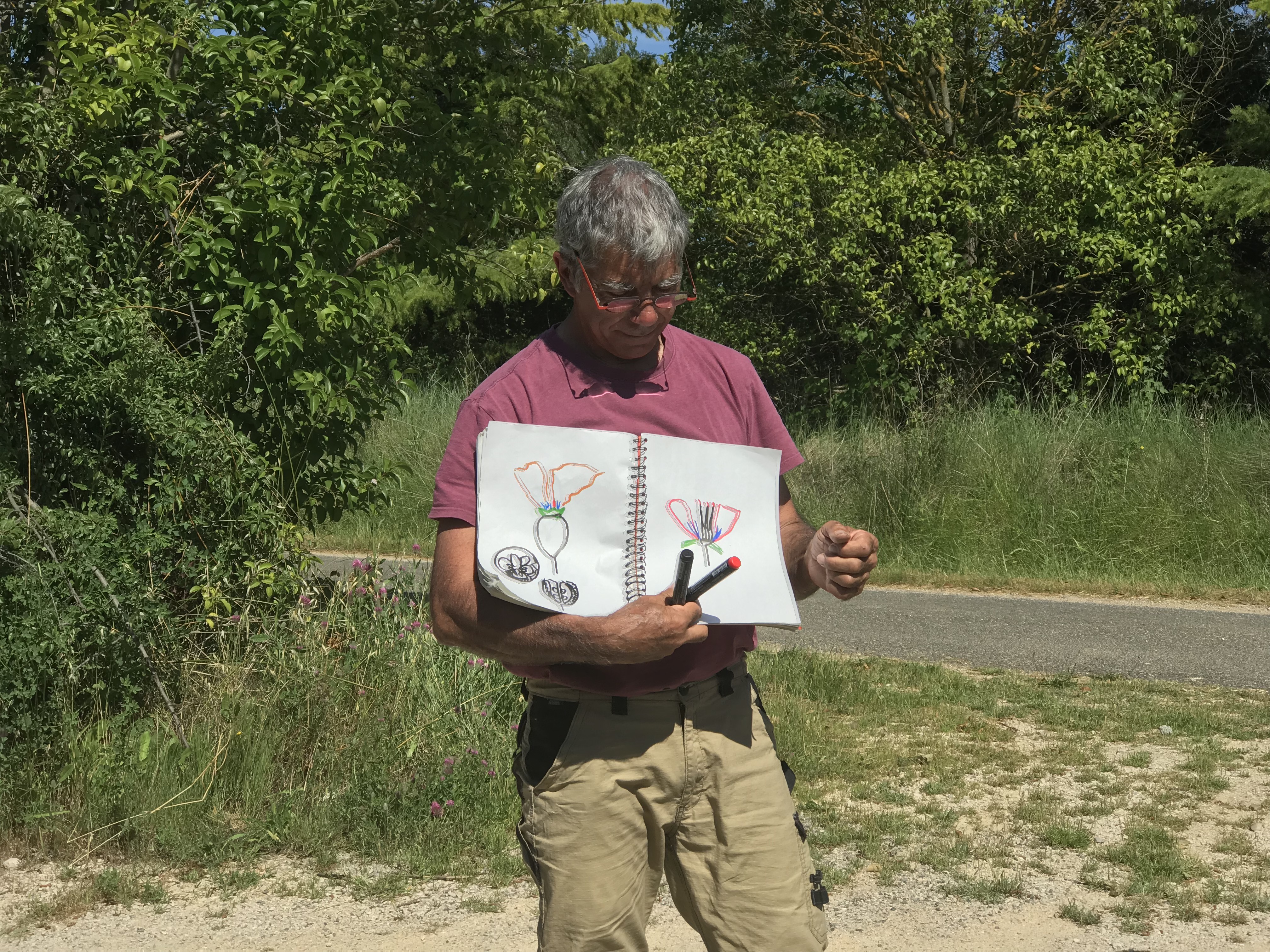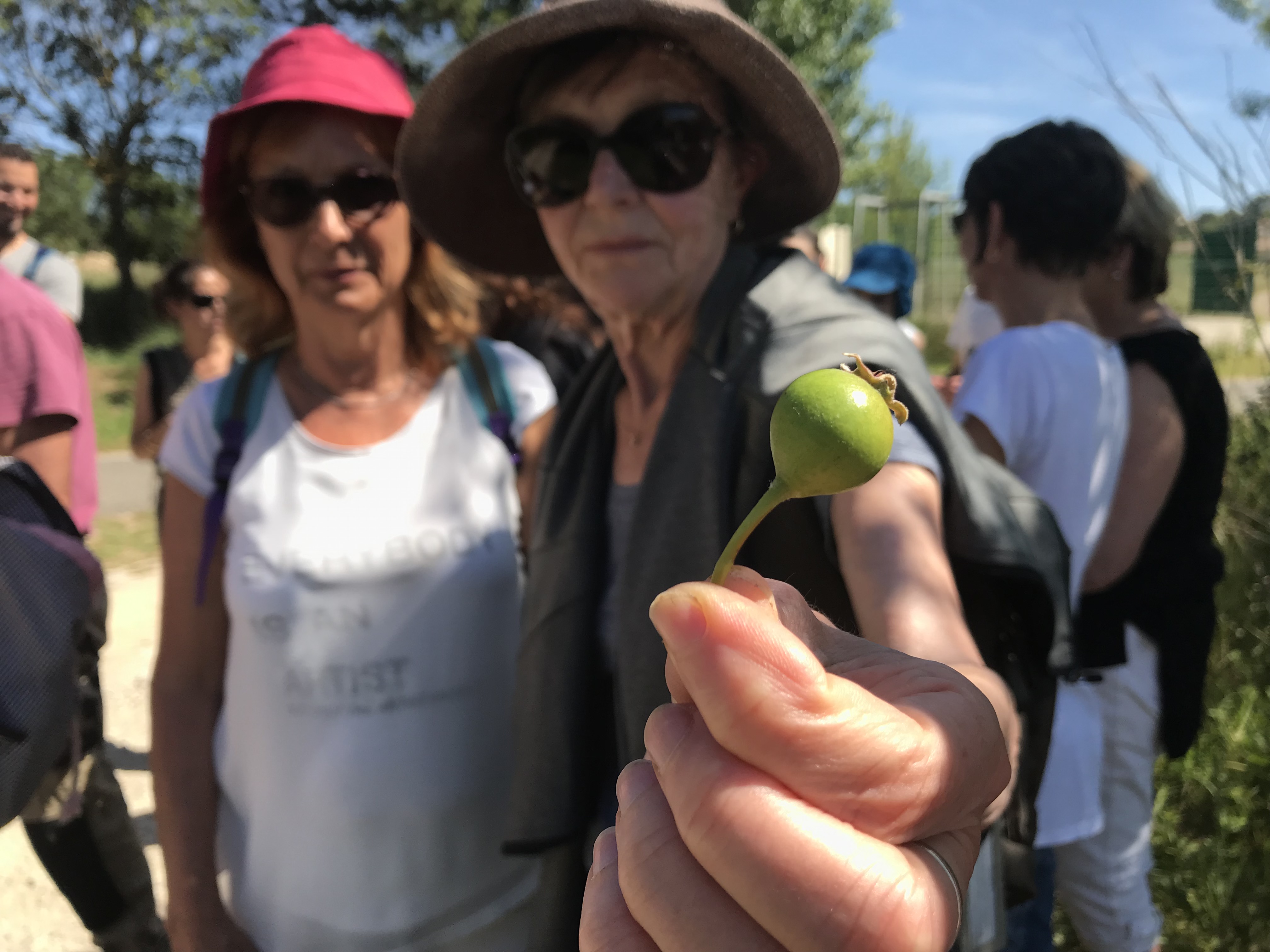 Le soleil est de la partie. L’ombre est rare. Un premier arrêt à la sortie du parking permet à Yves de rafraîchir les mémoires sur le système de la fleur qui regroupe les organes mâles et femelles qui donneront naissance au fruit : les sépales ou le calice, les pétales forment la corolle. C’est ce que l’on voit de loin, ce qui est attractif pour les yeux et pour les insectes. Les pièces périanthaires masquent les organes de reproduction. Nous allons nous intéresser au gynécée, la partie femelle de la fleur (formée par les carpelles).