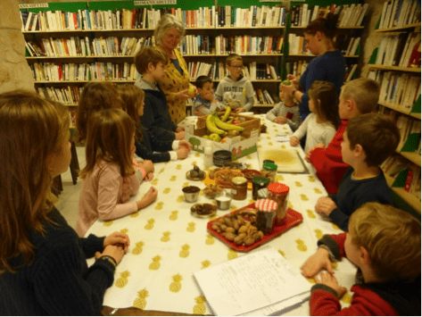 Les enfants installés autour d’une grande table ont tenté de reconnaître les fruits disposés devant eux. Après avoir fait la distinction entre les fruits sauvages que l’on trouve dans la nature (grenades, kakis pomme, figues…) et les fruits cultivés dans les vergers, l’animatrice a rappelé les fruits et « faux-fruits » utilisés en cuisine :