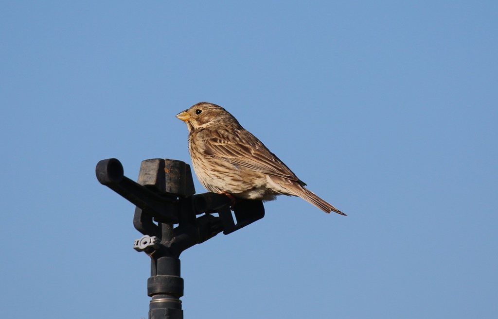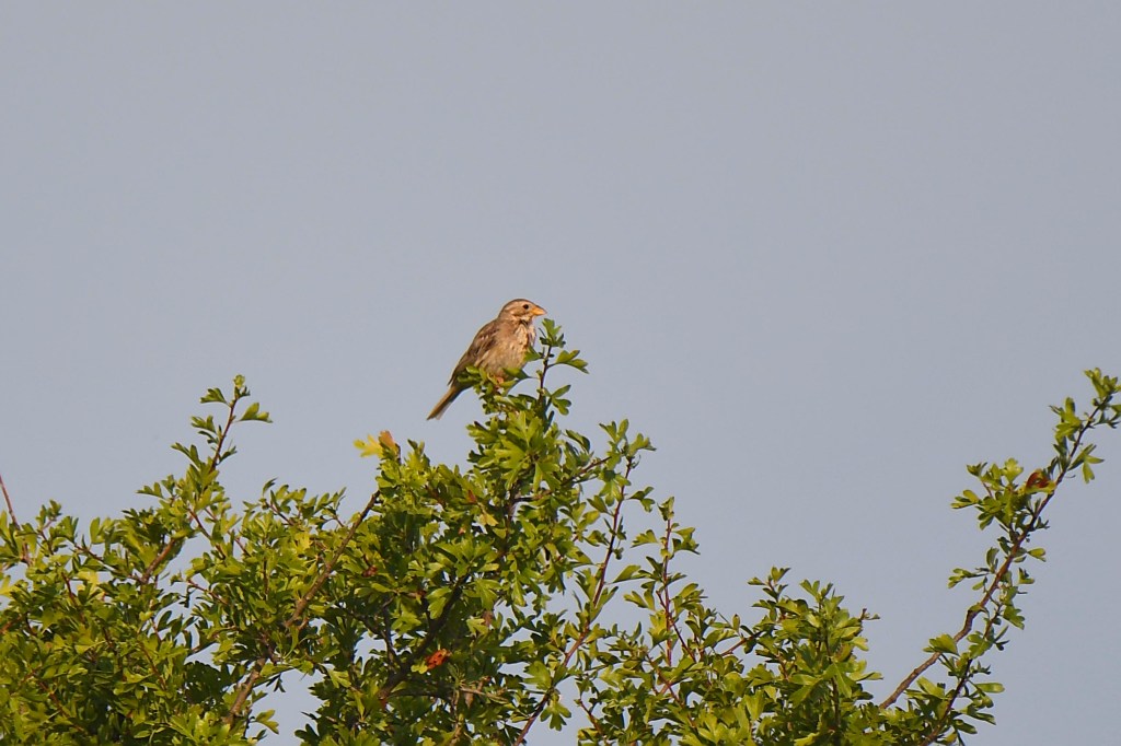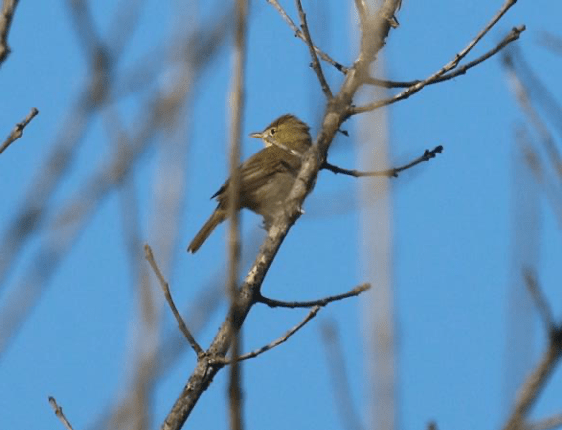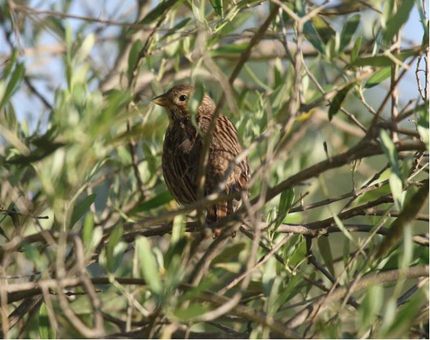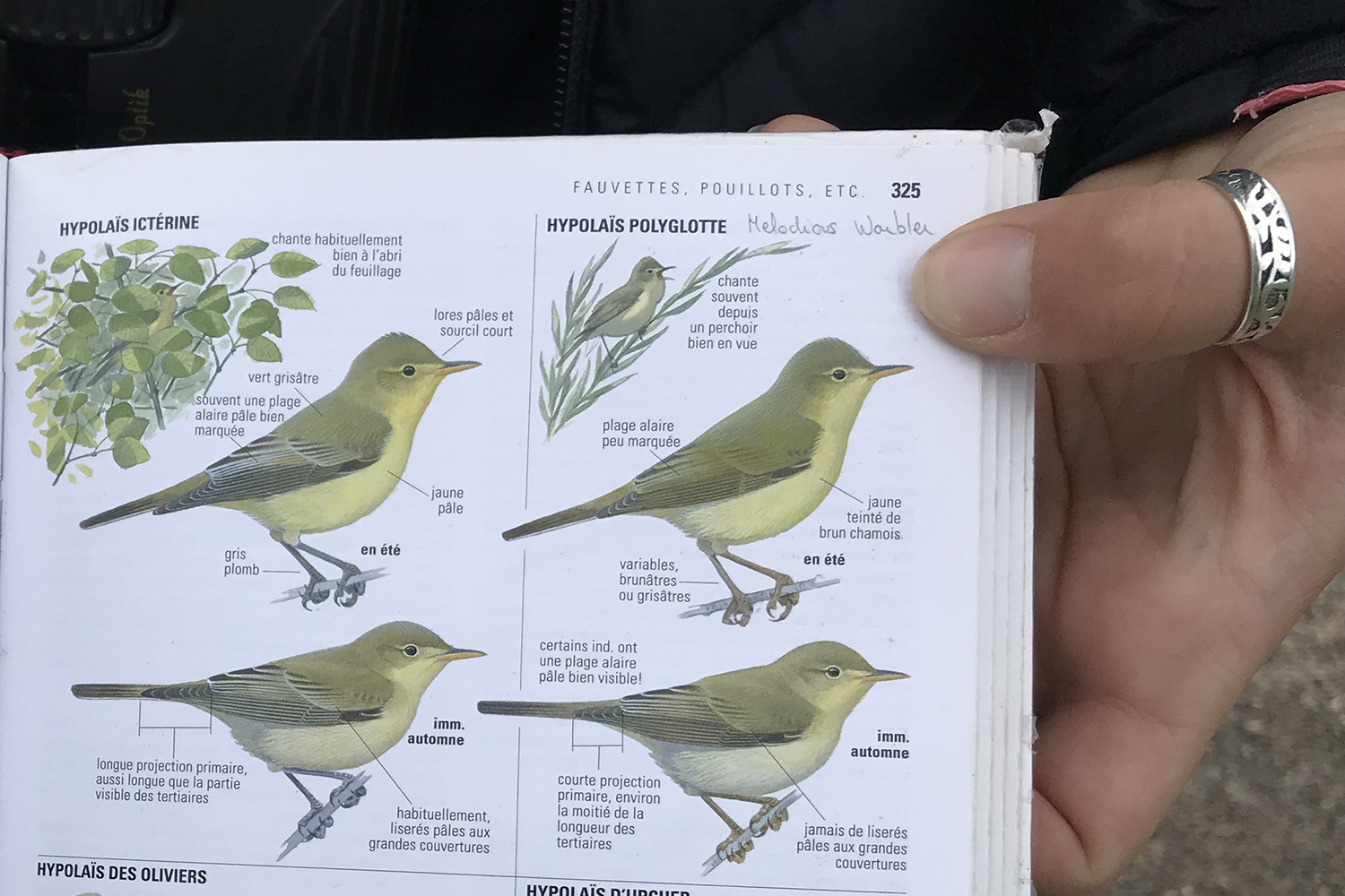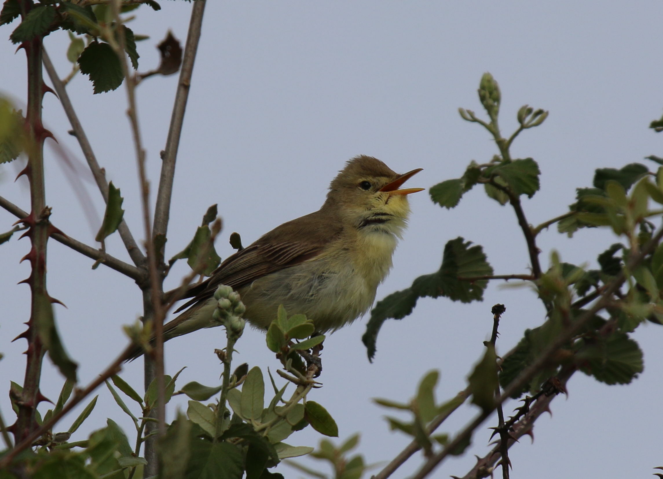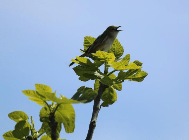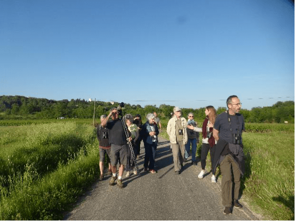 Les discussions sont interrompues par le chant mélodieux presque humain du Loriot, la silhouette jaune et noire du mâle est observable dans les grands frênes à proximité. Puis, nous continuons sur le chemin du Bois. Ce sont ensuite les trilles de l’Hypolaïs polyglotte qui attire notre attention tout autant que sa silhouette « punky ». Perché au sommet d’un amandier. Il nous fait la démonstration de tout son répertoire, tandis qu’un Rossignol tente de lui faire concurrence.